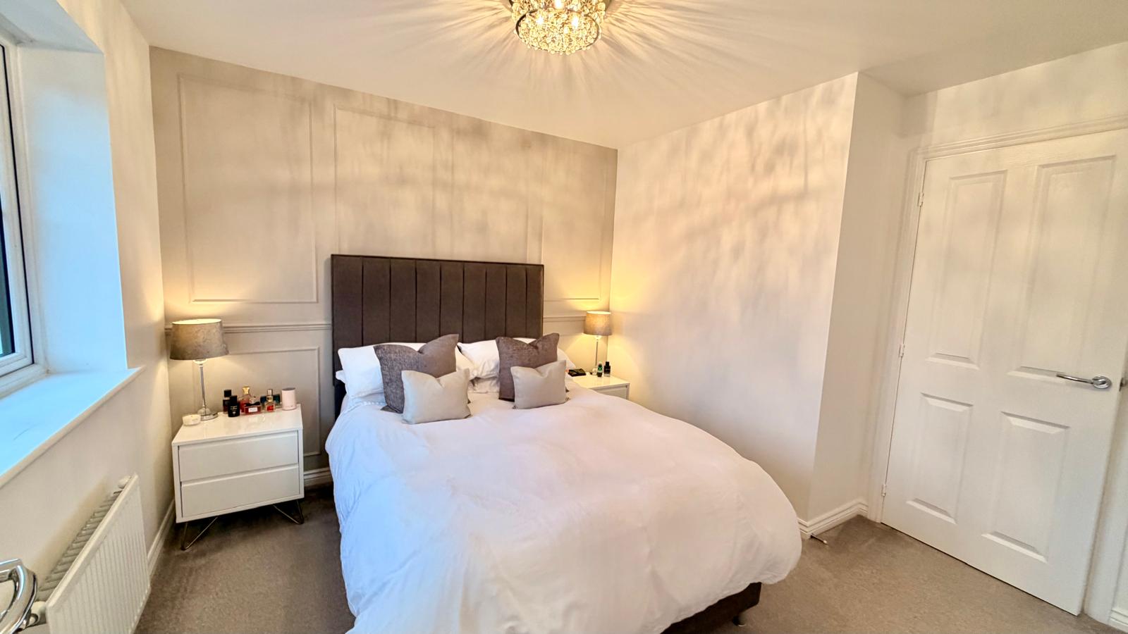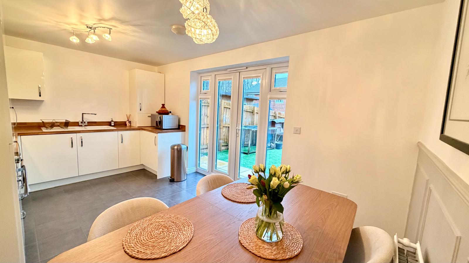 The home benefits from gas central heating and uPVC double glazing and briefly comprises; entrance Vestibule, a comfortable living room with panelled wall, a useful cloakroom/wc and a stylish open-plan fitted kitchen and dining area which opens into the rear garden and is ideal for modern family life and entertaining. To the first floor, the property offers a principal bedroom with panelled wall and door to a luxury en-suite shower room, two further well-proportioned bedrooms, and a modern family bathroom/wc complete the first floor.