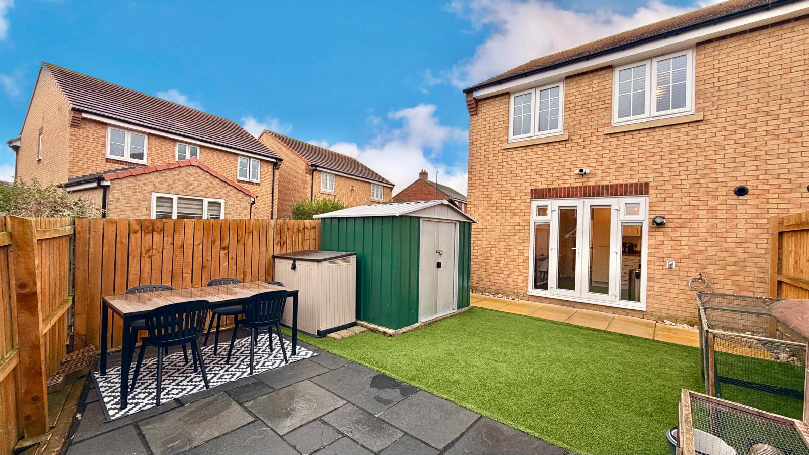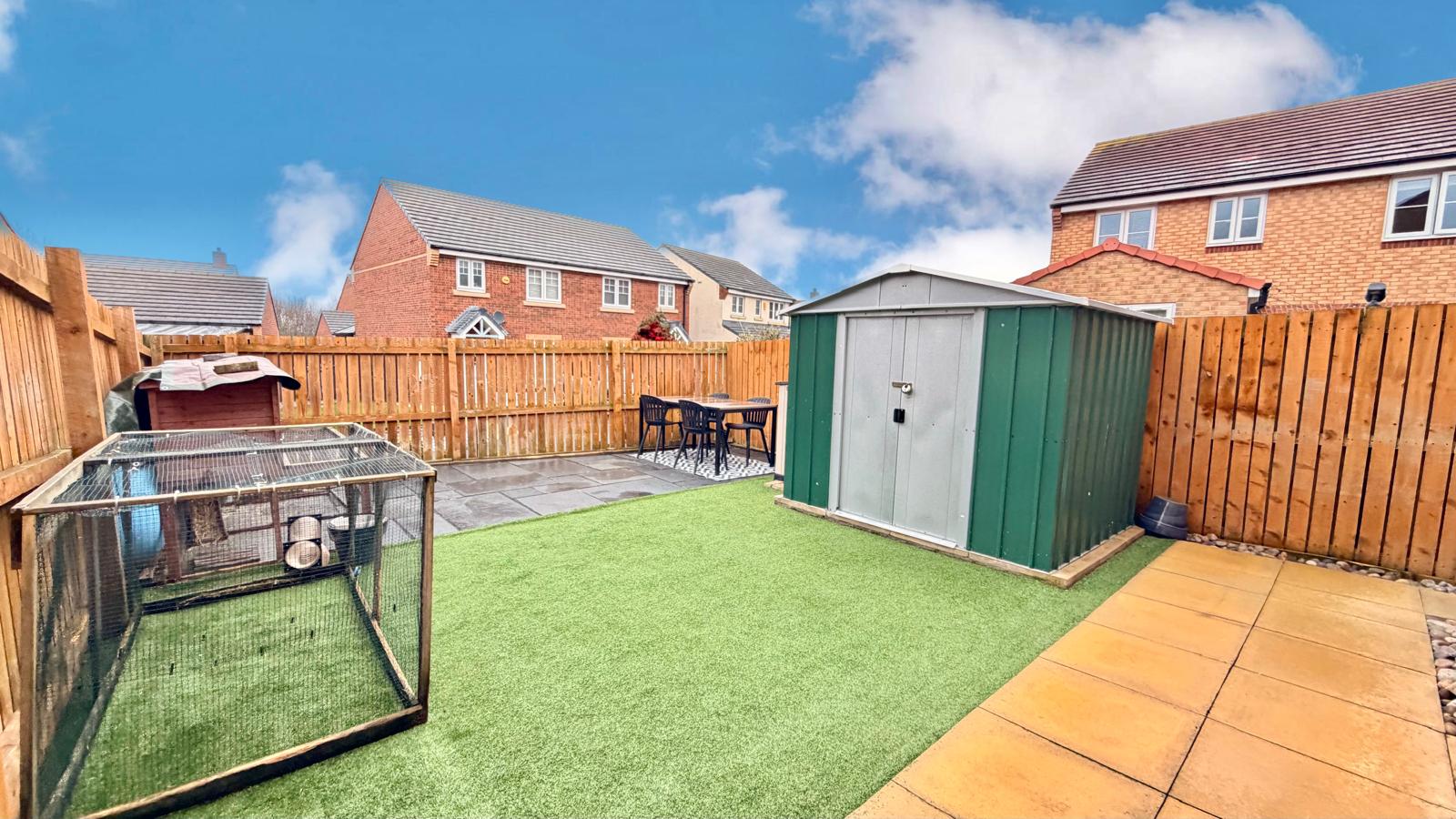 Enjoying a fantastic degree of privacy beginning with a paved patio area before extending to a mature artificial lawn and then a further paved patio area, side access gate to front.