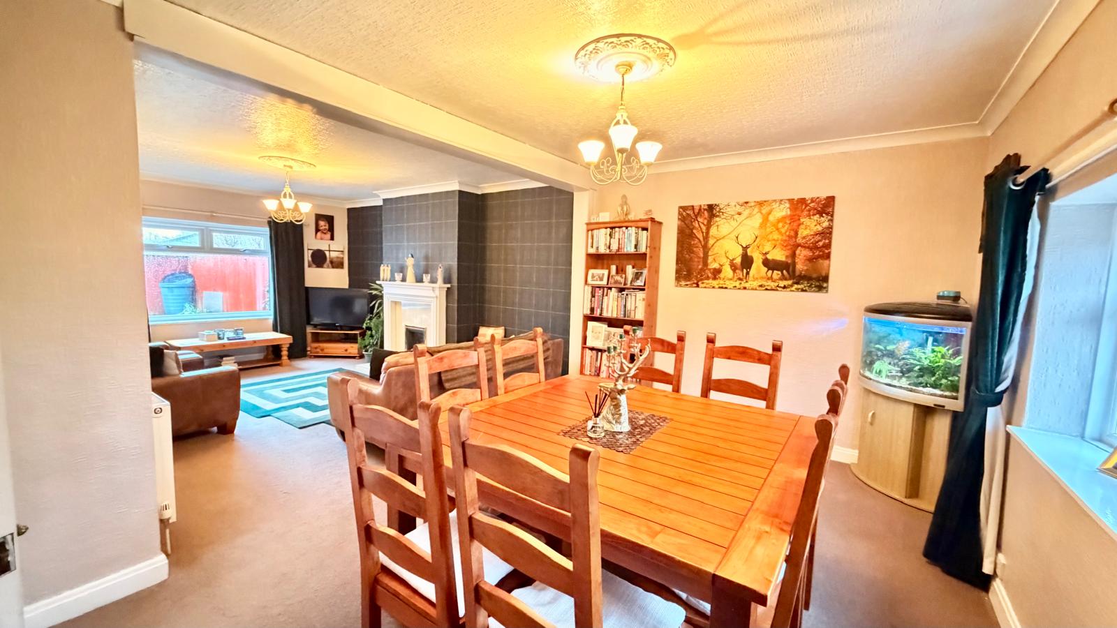 Dual aspect spacious room with ample space for a dining table and several sofa's, with uPVC window to front and rear aspects, two radiators, coved ceiling with centre cornice.