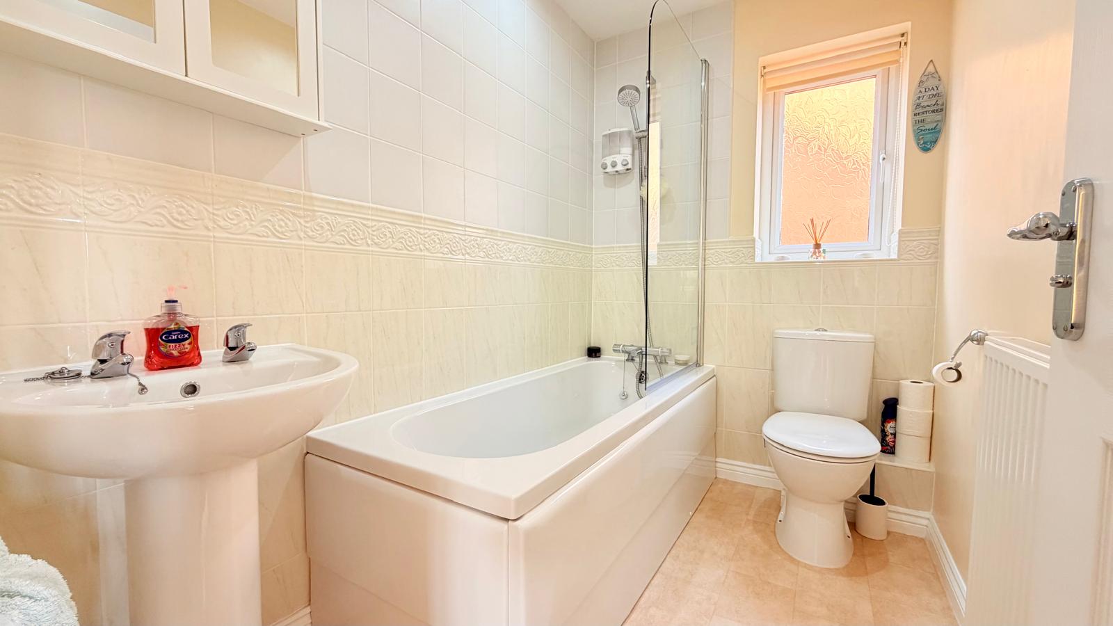 Partly tiled with white suite comprising panel bath with overhead shower and tiled splashbacks, hand basin and low flush wc, radiator, vinyl flooring, recessed spot lighting, uPVC window to side aspect and xpelair extractor fan.