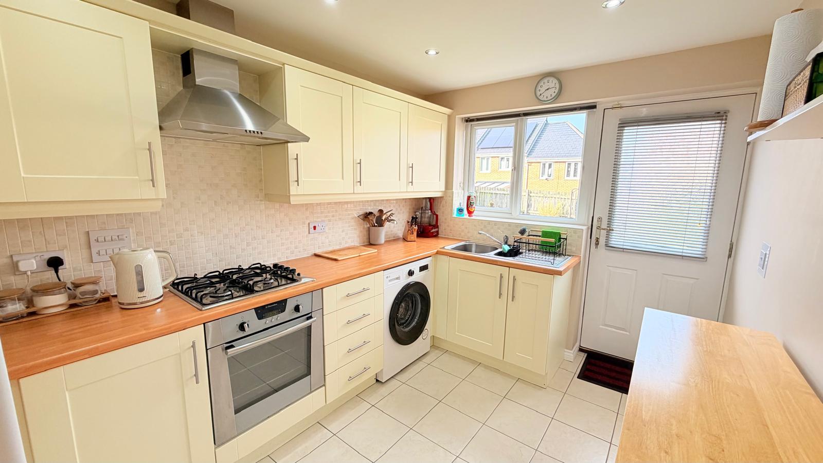 Fitted with range of cream wall and floor units incorporating a bowl and a half stainless steel sink with window above overlooking the rear garden, laminate working surfaces, integrated fan assisted electric oven with a four-ring gas hob and extractor hood over, space and plumbing for an automatic washing machine, radiator, part tiling above the working surfaces, ceramic tiled flooring, recessed spot lighting and a half-glazed door leading out into the rear garden.