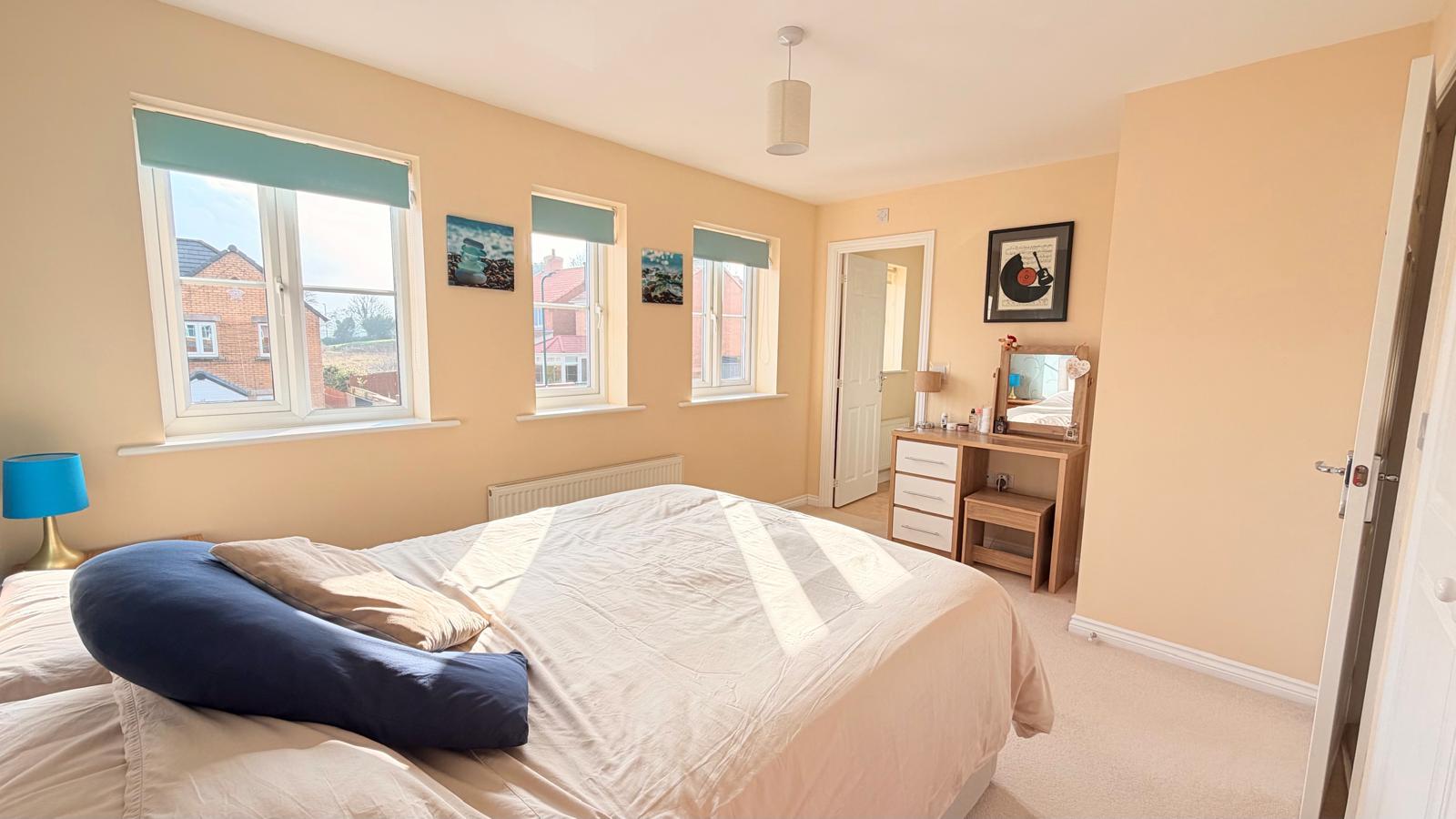 To the first floor are three genuine double bedrooms, a rare and highly desirable feature for modern family living. The spacious principal bedroom includes fitted wardrobes and a private en-suite shower room, while the remaining bedrooms are equally well proportioned.