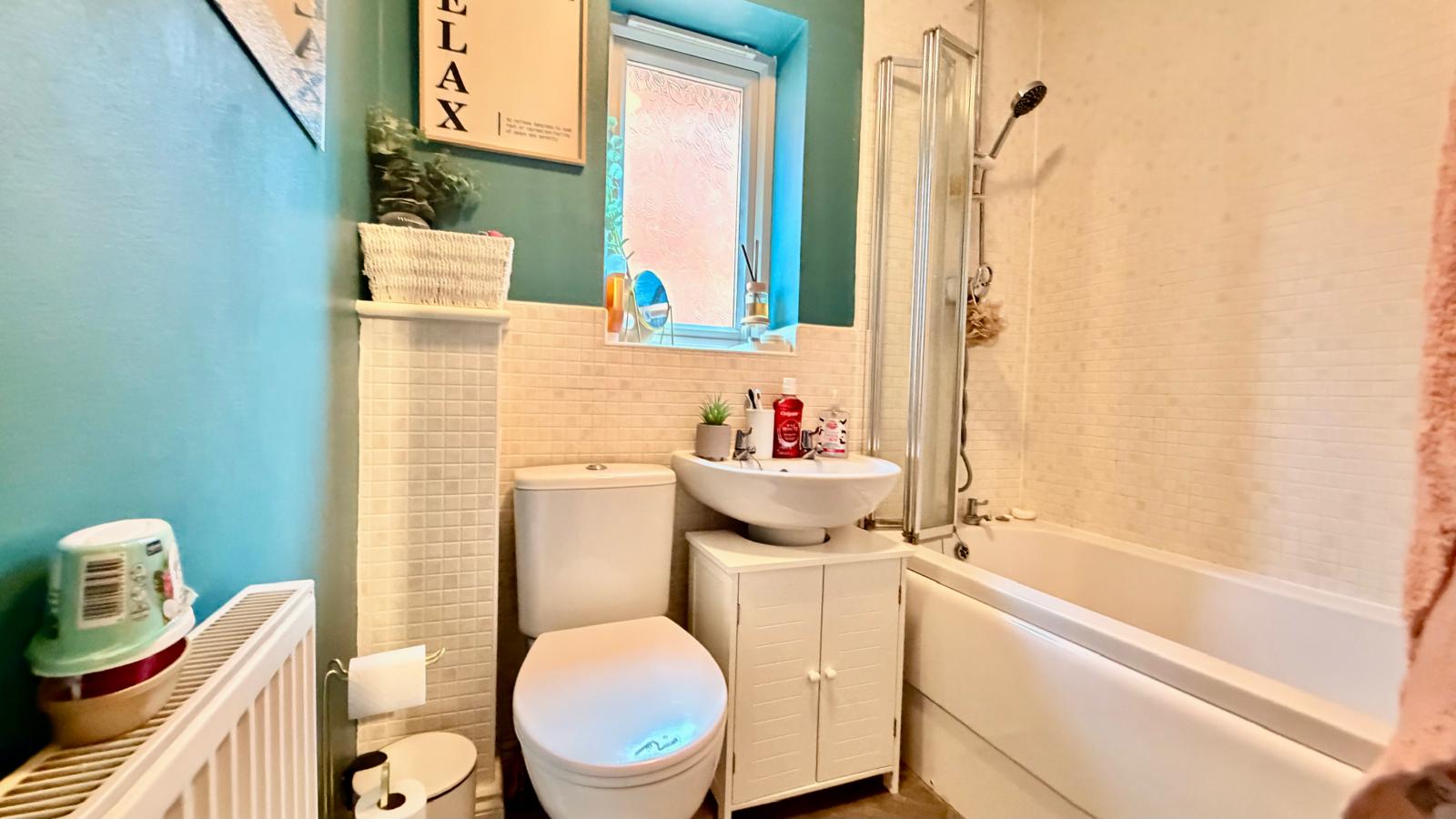 Modern white suite comprising low flush WC, pedestal wash hand basin and panel bath with overhead shower, part tiled walls, extractor unit, vinyl floor and uPVC double glazed window.
