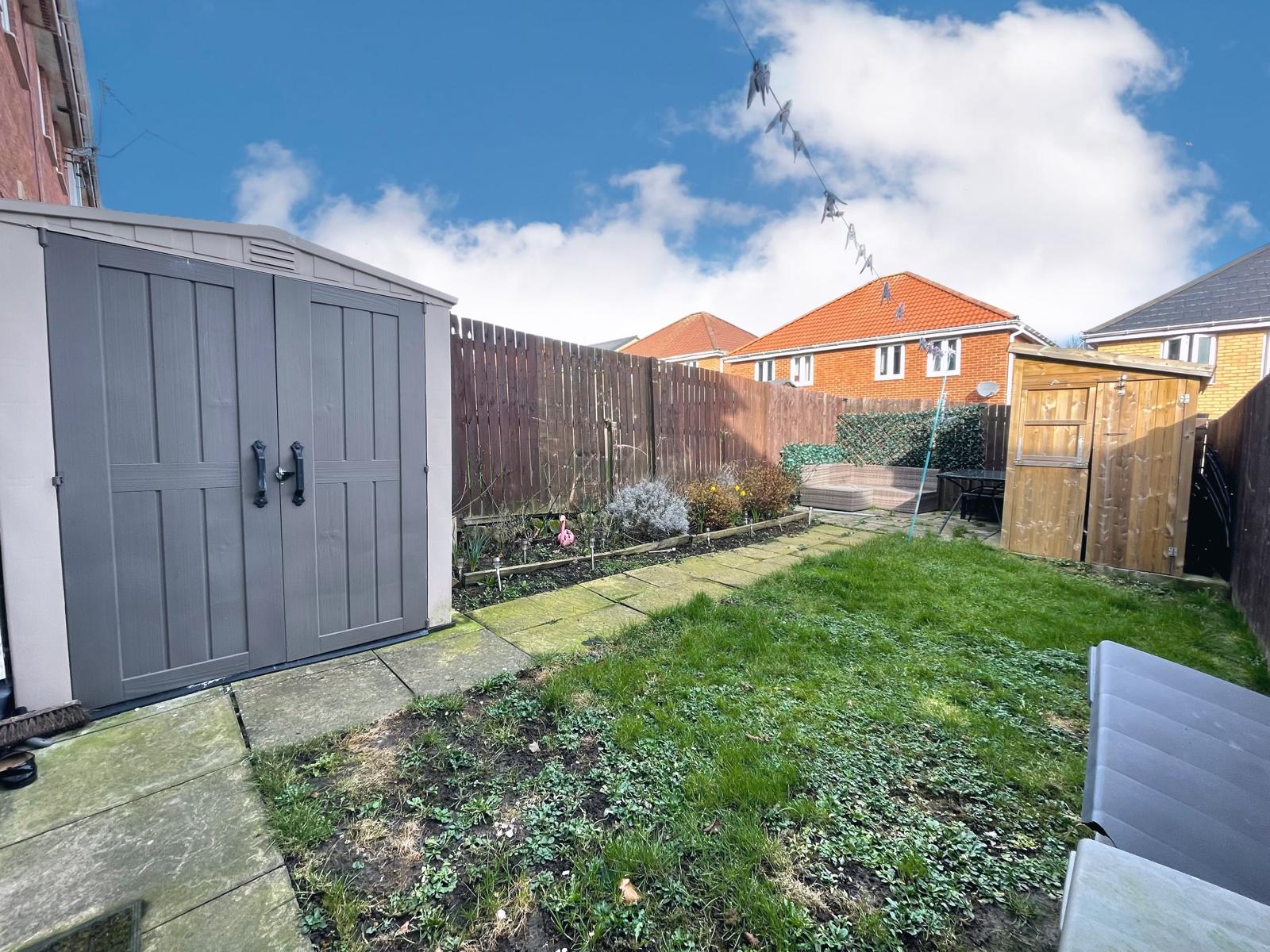 Fence enclosed rear garden which incorporates a lawned area, mature and stocked borders and storage shed.