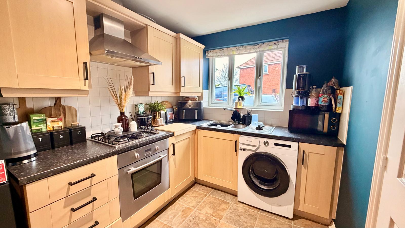 Attractive range of Maple wall and base units with cupboards and drawers, laminate effect worktops, built-in stainless steel fan assisted electric oven and gas hob with concealed extractor hood over, one and a half inset stainless steel drainer and unit with mixer tap, plumbing for an automatic washing machine, cupboard housing the wall mounted gas central heating boiler, digital control unit adjacent, part tiled walls, radiator, uPVC window to front, space for dining table.
