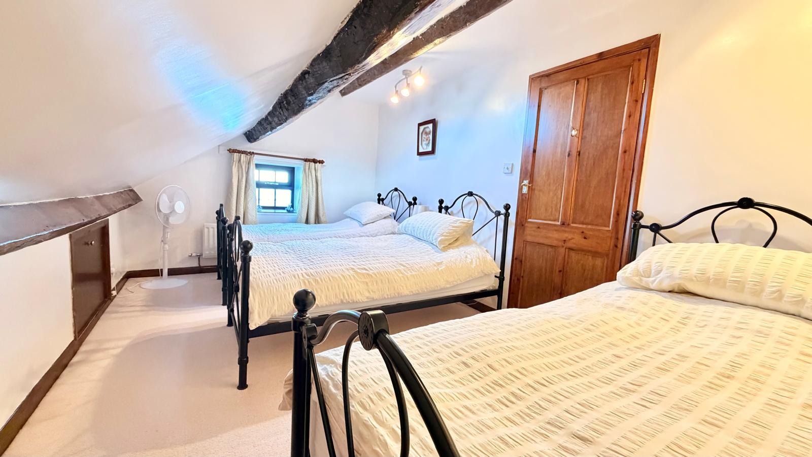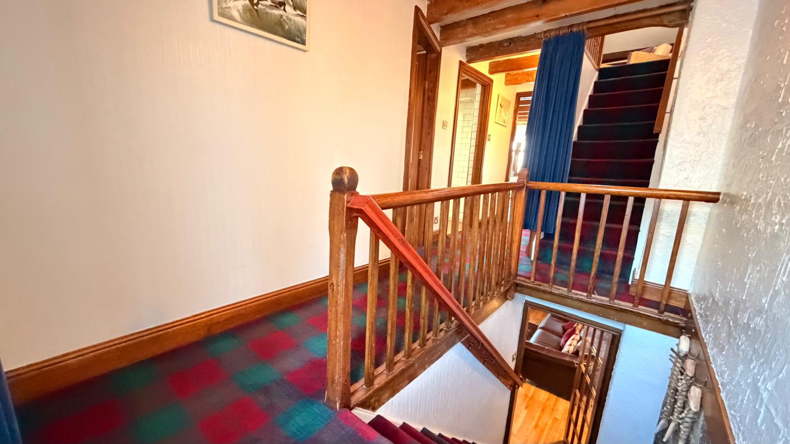 Window to the rear aspect, feature beamed ceiling, radiator, tartan carpet, built-in storage cupboard, access to all first floor rooms and further staircase leading to the second floor.