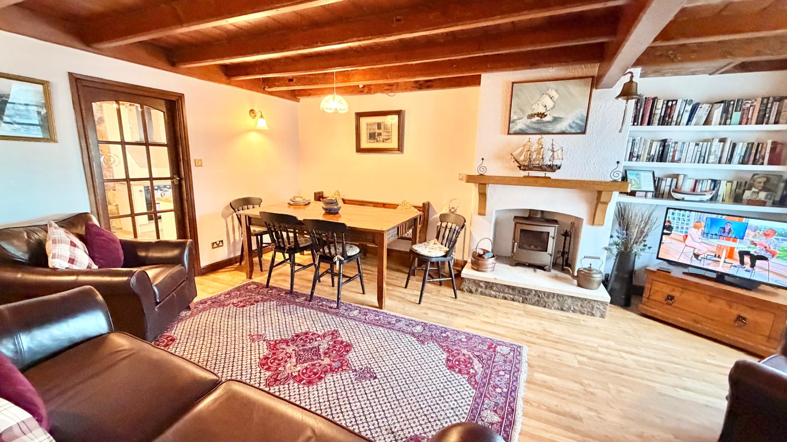 Elevated from the front aspect with timber double glazed sash windows to the front aspect offering fantastic harbour side views looking out to sea, beautiful eye catching beamed ceiling created from ships timbers, feature Inglenook fireplace housing a cast iron wood burning stove, central heating radiator, space for dining table, laminate flooring, glazed door leading to staircase to first and second floors, and glazed door leading through to:-.