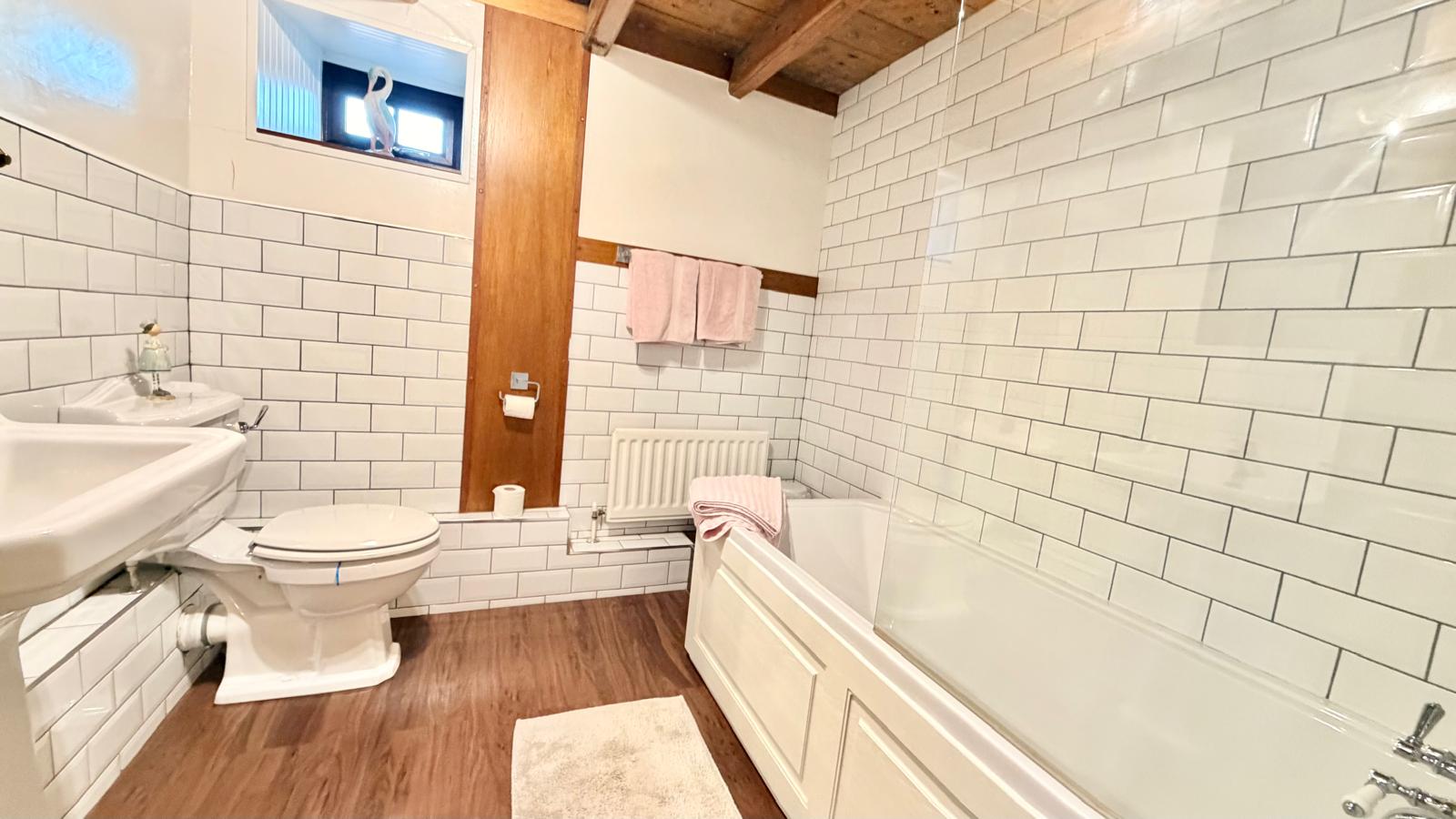 A three piece suite in white comprising panelled bath with overhead chrome shower attachment and telephone style shower and taps with a glazed screen, wash hand basin, push button w/c, laminate flooring, tiled splashbacks, small window to side aspect, traditional beamed ceiling and central heating radiator.