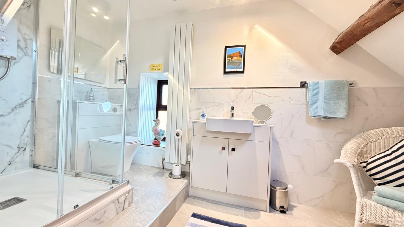 A modern white suite comprising double shower stall, wash hand basin and w/c with view above, central heating radiator and eaves storage.