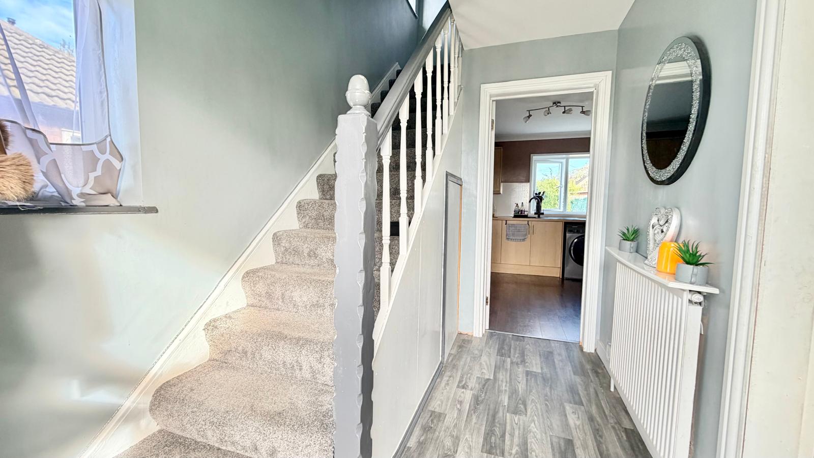 uPVC double glazed entrance door, uPVC side window, under stair storage cupboard, radiator and staircase to first floor.