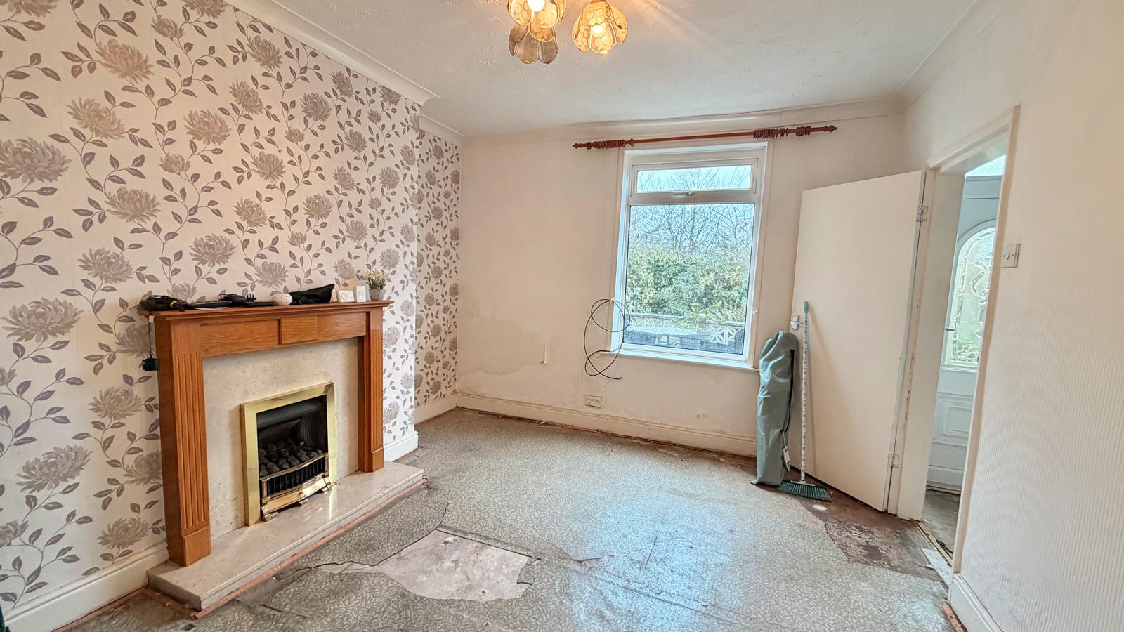 uPVC sealed double-glazed window to the front aspect with views to the front garden and fireplace, understairs storage cupboard and door to:-