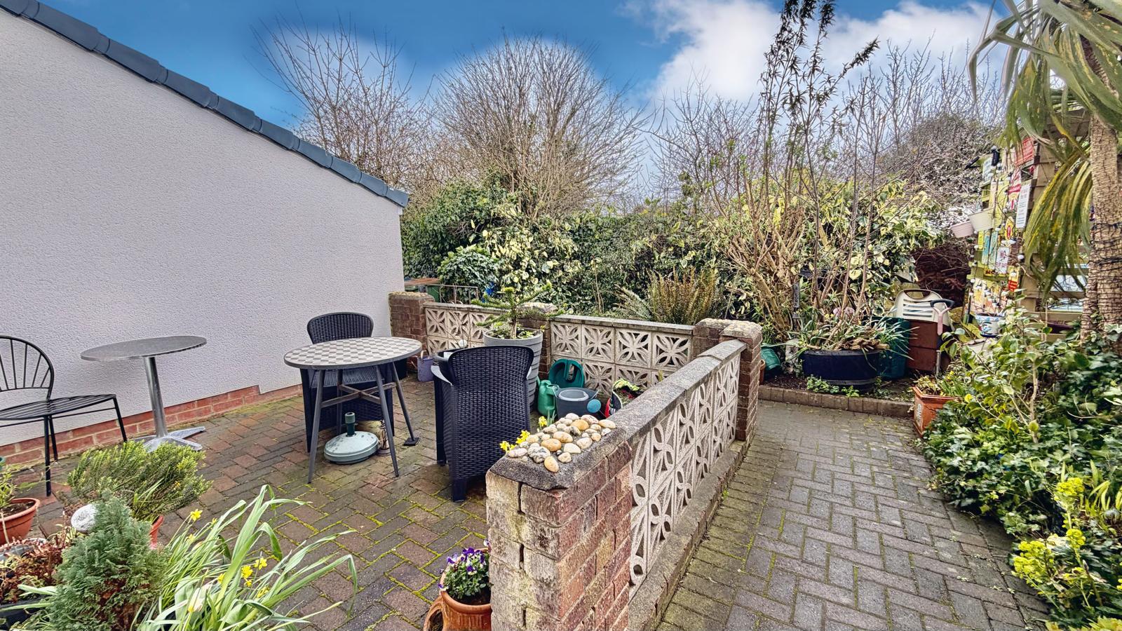 Dwarf wall enclosed patio garden with planting (not overlooked) with shared pathway access immediately in front of the houses leading to neighbouring properties.
