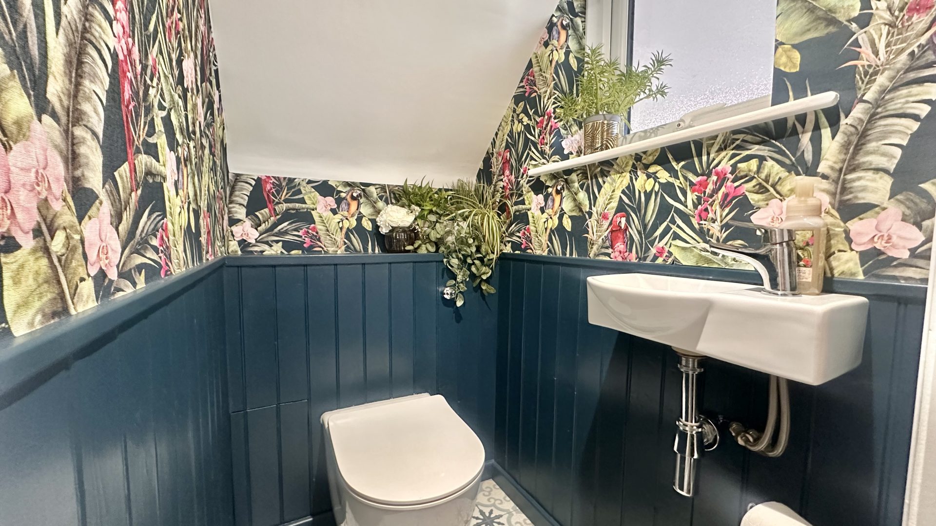 With Georgian half panelled wall, modern suite with back to wall wc, wash basin ceramic tiled flooring and uPVC window to side aspect.
