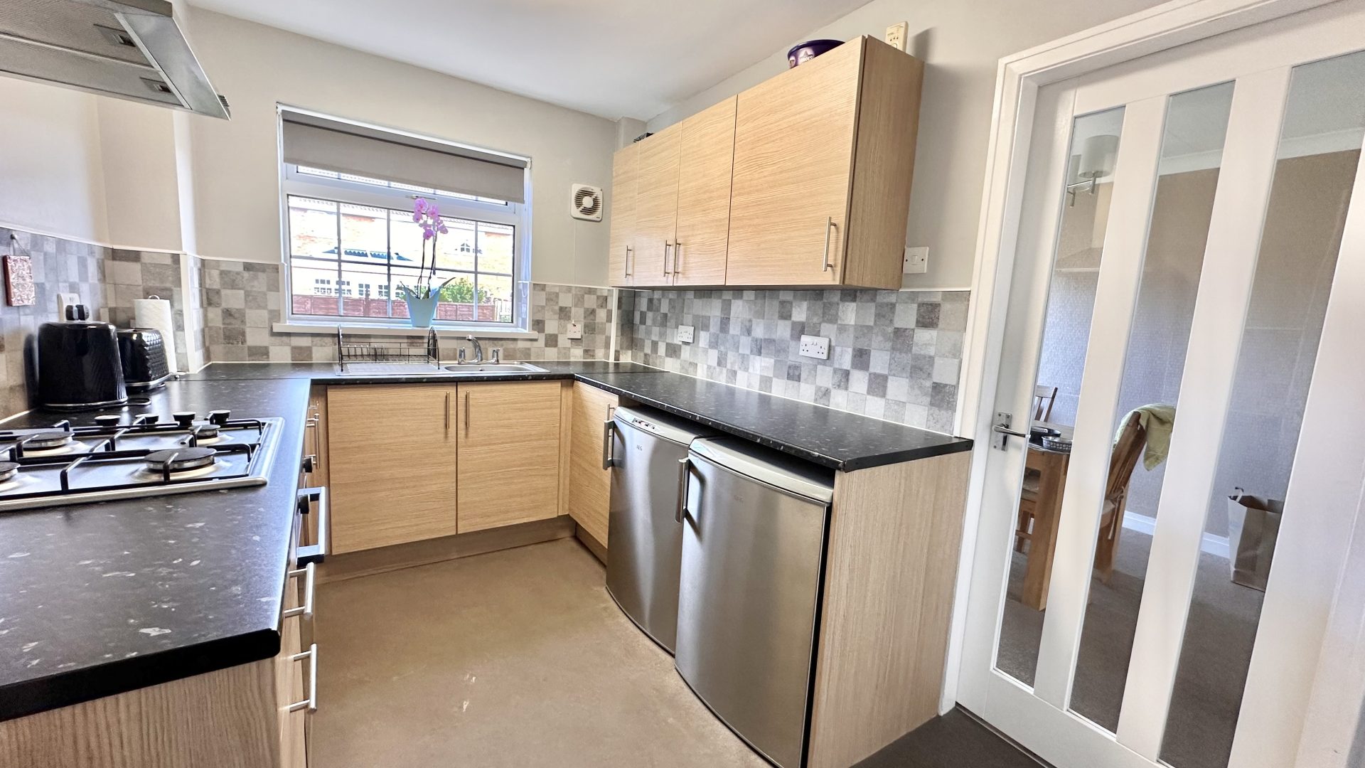 Fitted with a range of modern all and base units with laminate working surfaces and tiled splashbacks, single drainer sink unit with mixer tap, integrated fan assisted electric oven with four ring gas hob and overhead extractor hood, space for under counter fridge and freezer, window overlooking the rear garden, vinyl flooring, double pantry cupboard and door to:-.