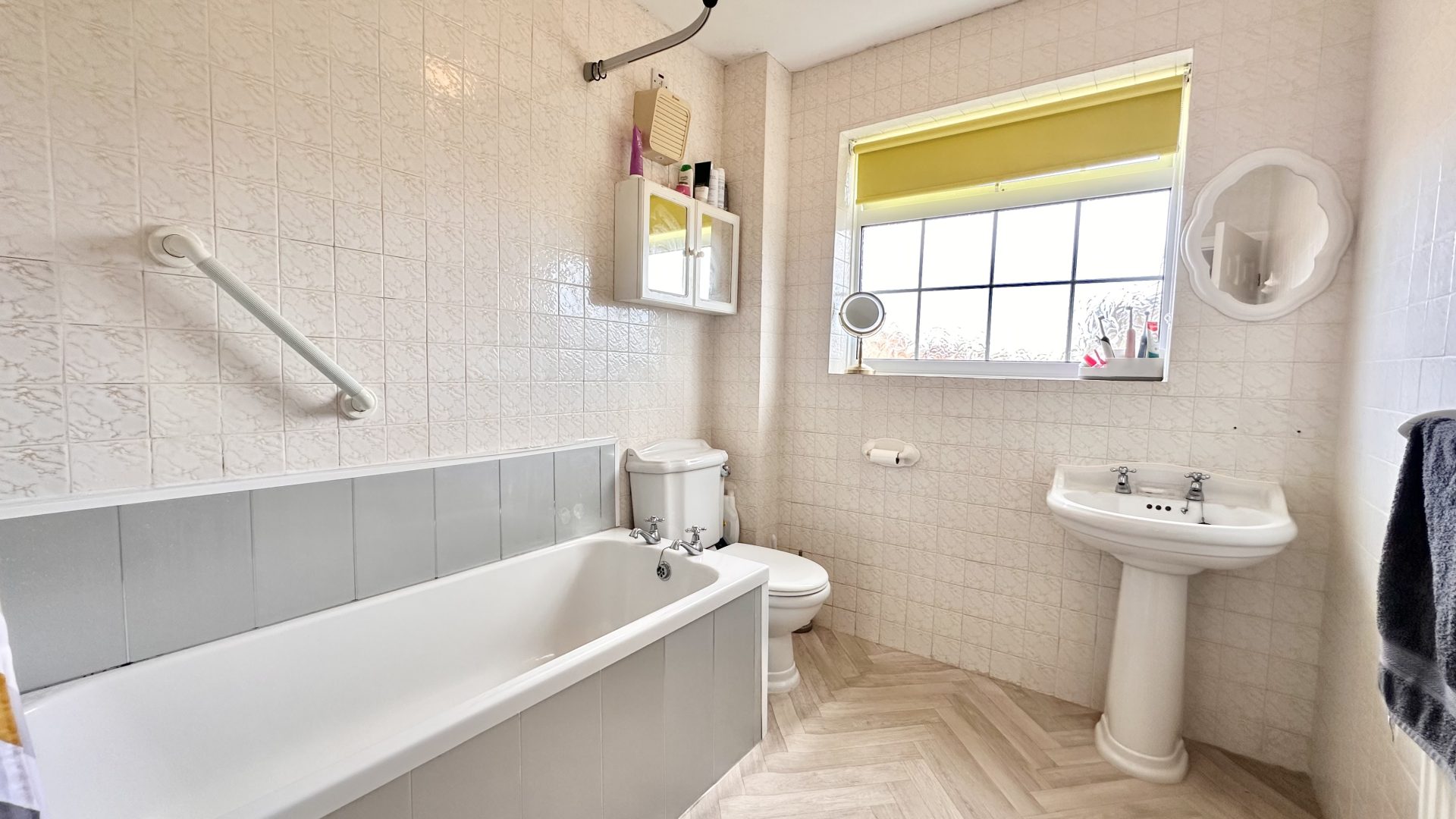 Modern bathroom suite in white being fully tiled and comprising; panelled bath and overhead shower, low level wc, pedestal wash hand basin, Herringbone vinyl flooring, radiator and uPVC window to rear aspect.