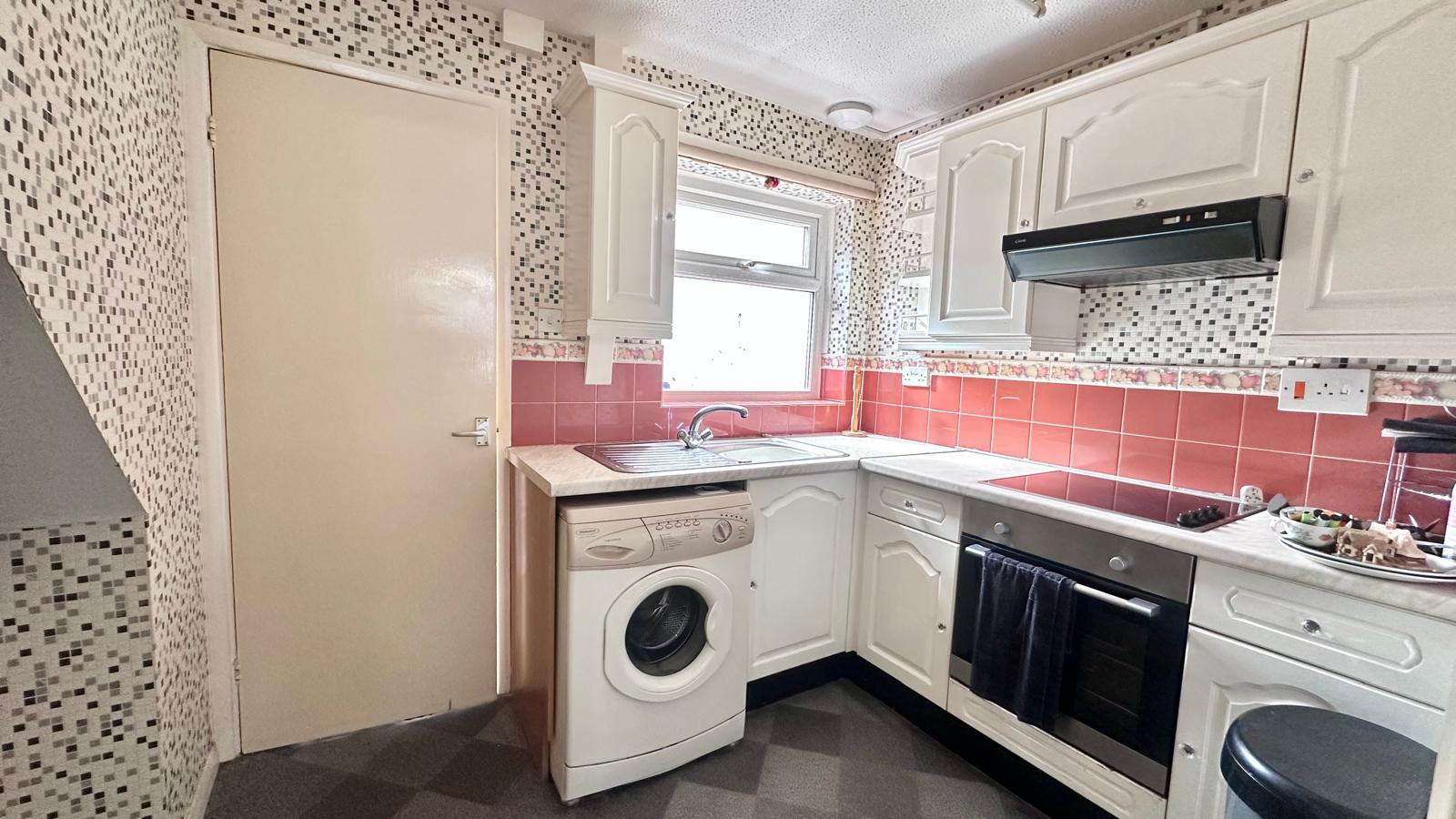 Fitted with a range of wooden fronted white wall, base and drawer units finished with laminate work surfaces with tiled splashbacks, stainless steel inset sink unit with mixer tap over, integrated stainless steel fan assisted electric oven, 4 ring hob with overhead extractor hood, plumbing for a washing machine, understairs counter space and units, vinyl flooring, radiator, uPVC double glazed window to rear and door to:-