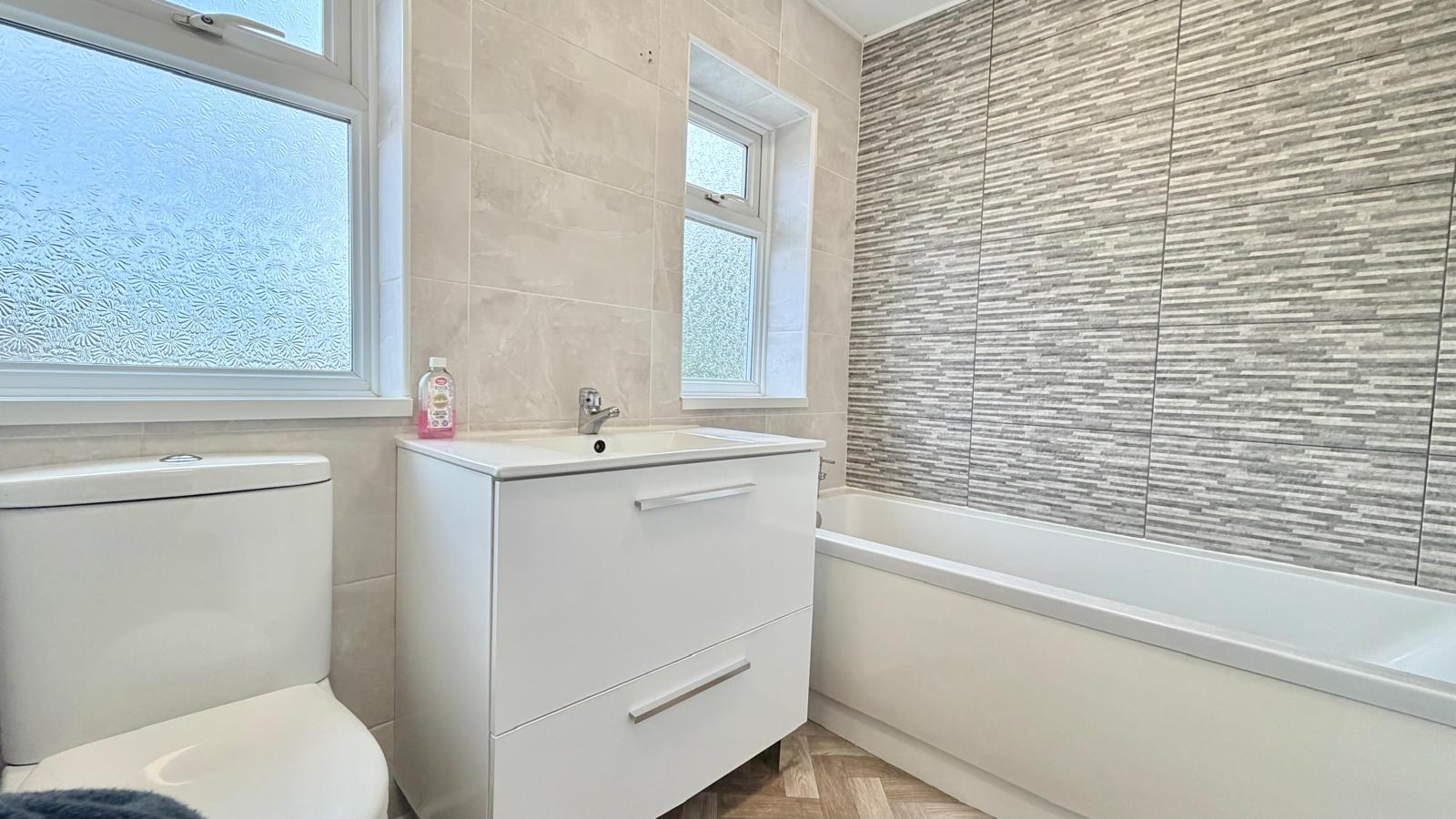 Offering a super modern three piece suite comprising; panel bath with over shower and glazed side screen, vanity wash hand basin with cupboard under, low level push button wc, uPVC window to rear aspect, radiator, Herringbone vinyl flooring.