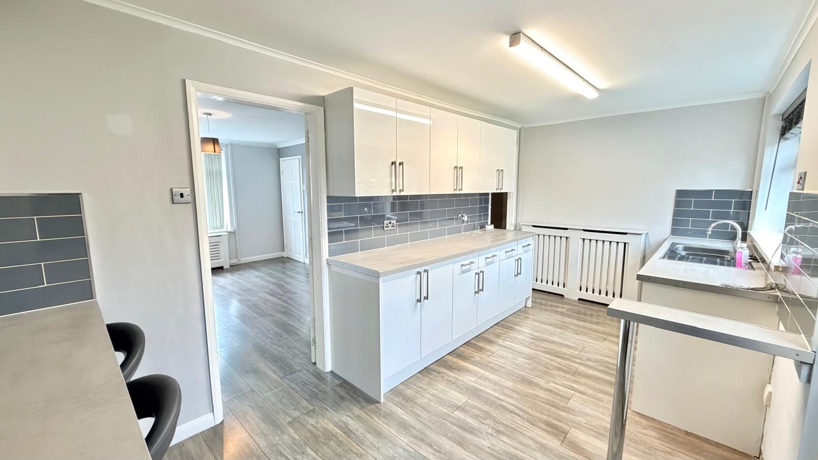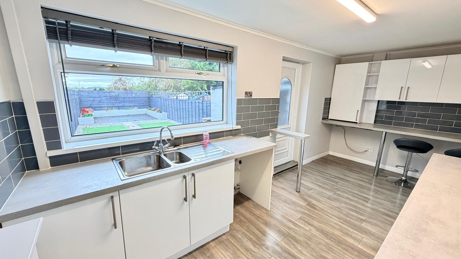 uPVC window to rear aspect, rear access double glazed door, fitted with a range of matching white coloured wall and base units with marble effect worktops, plumbing for washer, gas cooker point, 1 1/2 bowl sink unit with mixer tap, Metro tiled splashbacks, matching breakfast bar and seating area, grey laminate flooring and understairs walk-in storage cupboard.