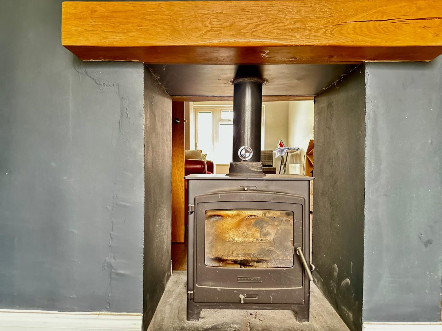 Opening into this good sized room which offers a double sided wood burning stove on tiled hearth with oak mantle, radiator, useful storage cupboard, laminate flooring, coved ceiling and access throughout :-