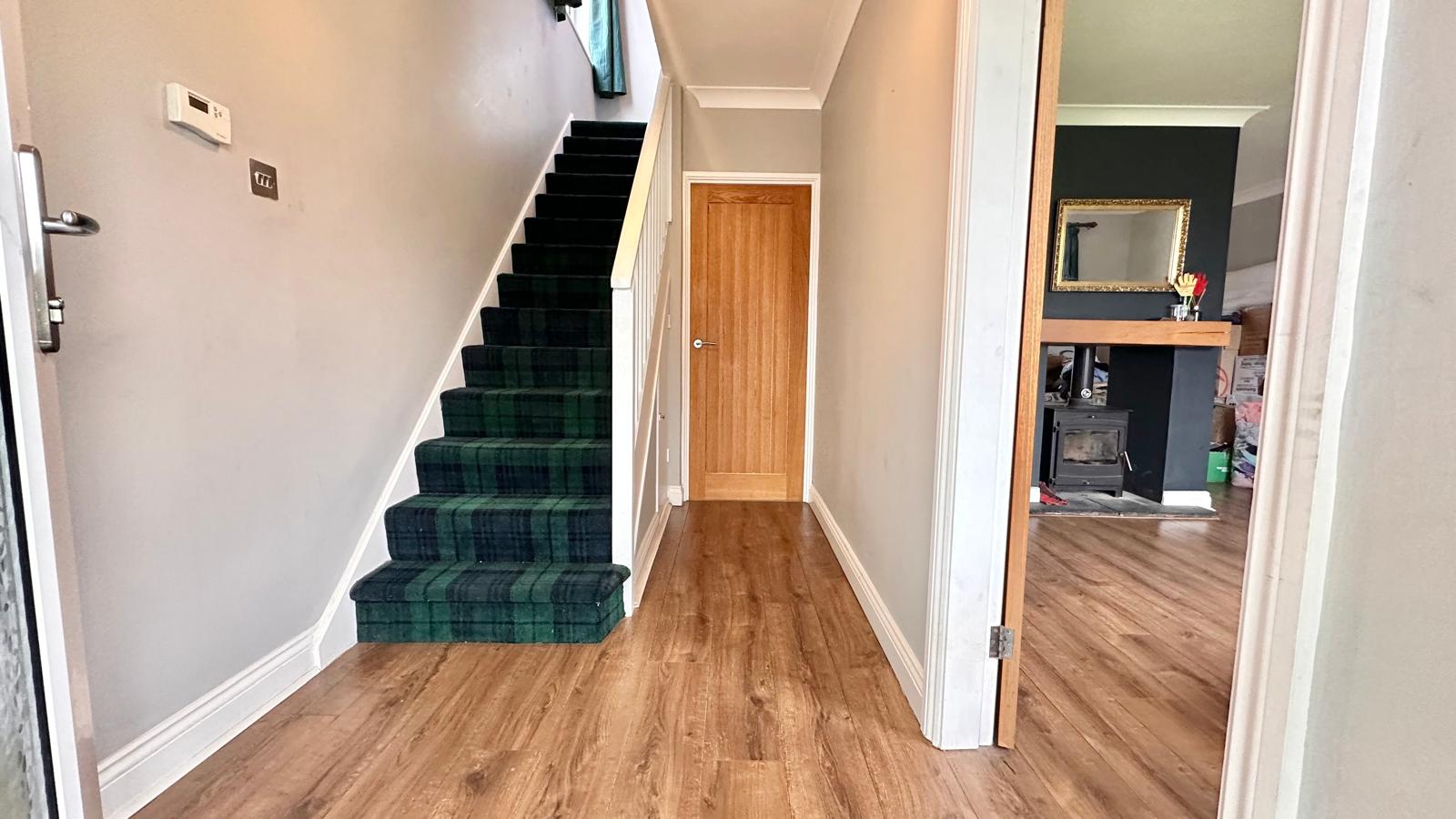 With attractive spindle staircase to the first floor, useful understairs storage cupboard, radiator, laminate flooring, tartan carpet and ceiling coving.