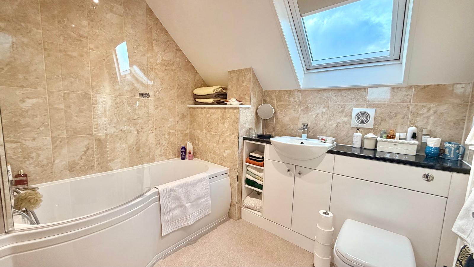Fully tiled suite offering a panelled bath, side by side push button wc and wash hand basin with vanity tops and storage, Velux window, chrome heated towel radiator, recessed spotlighting, extractor fan.
