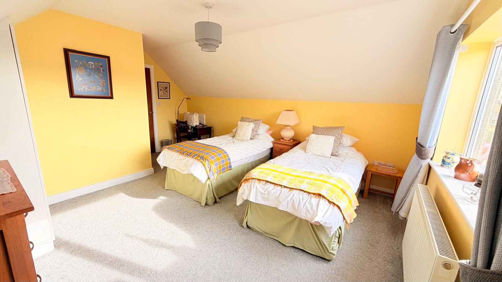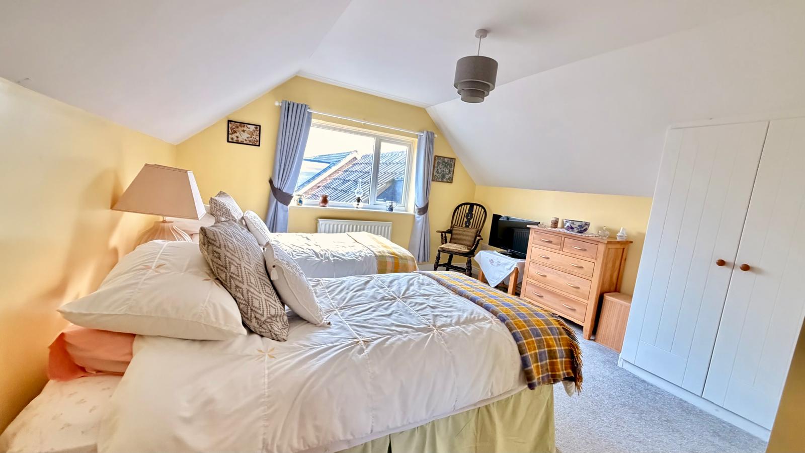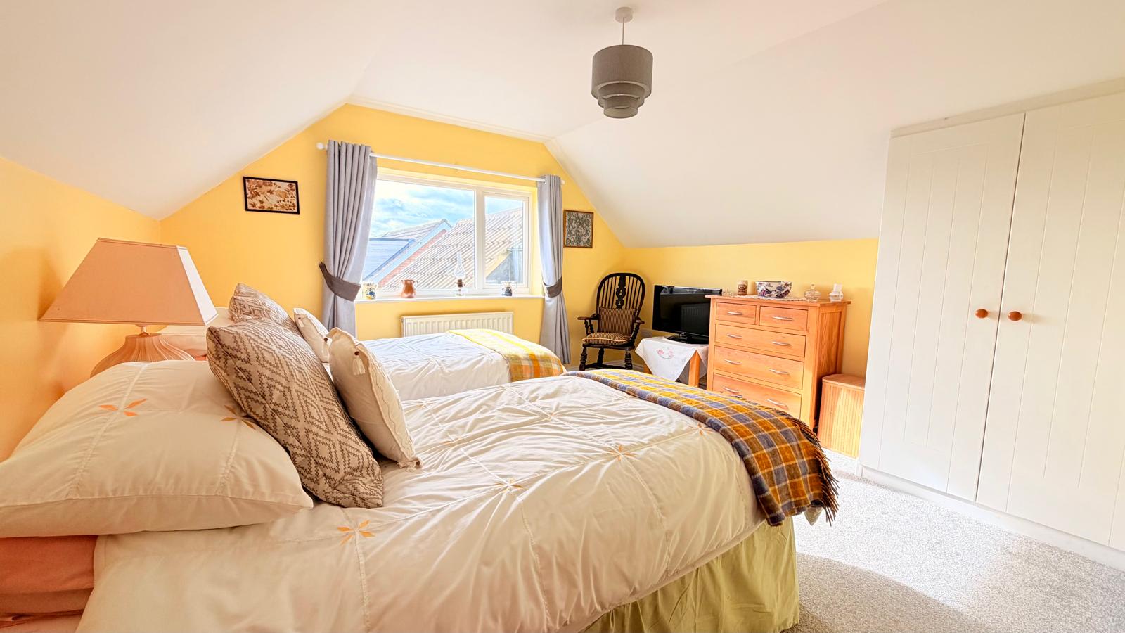 This wonderful light and airy family home is decorated in a neutral palette throughout and has been particularly well cared for by the current owners with accommodation briefly comprising; Entrance Porch into a useful Cloakroom/wc, door leading into the extended family Dining Room which enjoys a large set of French doors leading out into the substantial rear garden and an archway leading into the good size family Breakfast Kitchen. Thereafter, the inner Hallway leads to the main Living Room, Shower Room, two Bedrooms (one with fitted wardrobes) and the useful Study/Storage Room, with a pine staircase which leads to the first floor level. The first floor represents an ideal place for guests to stay offering two larger size bedrooms and a modern bathroom/wc and enjoys elevated views.