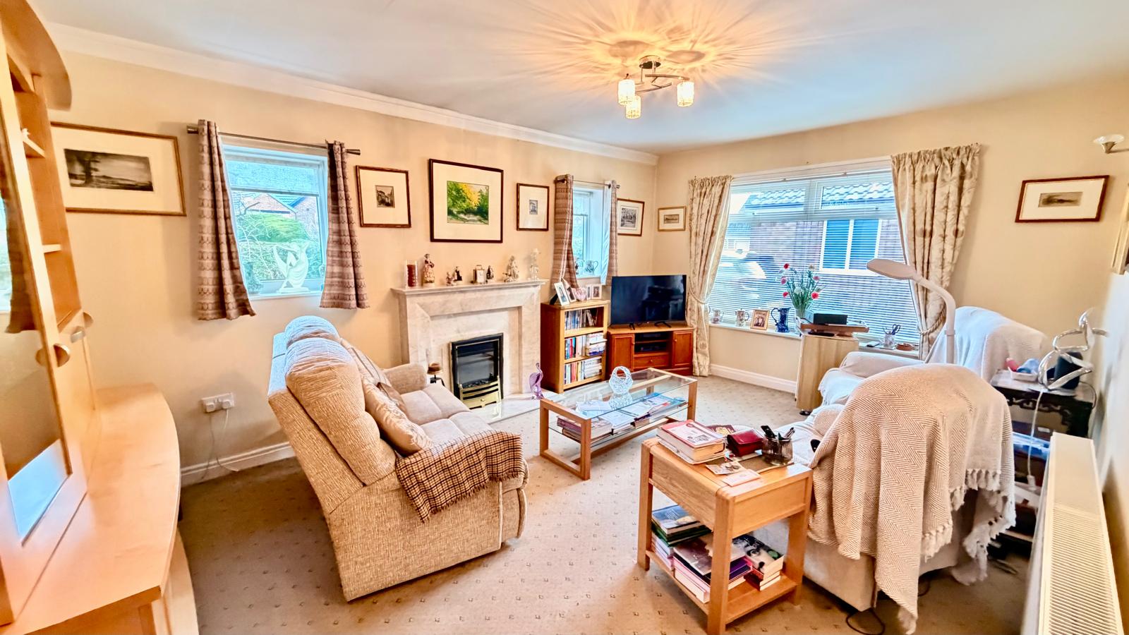 Two uPVC double glazed windows to front aspect with a further uPVC double glazed window to side aspect offering a light and airy room, radiator, two double wall lights and marble effect fire suite.