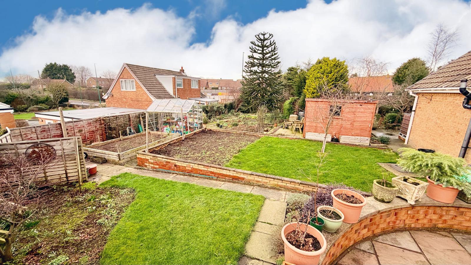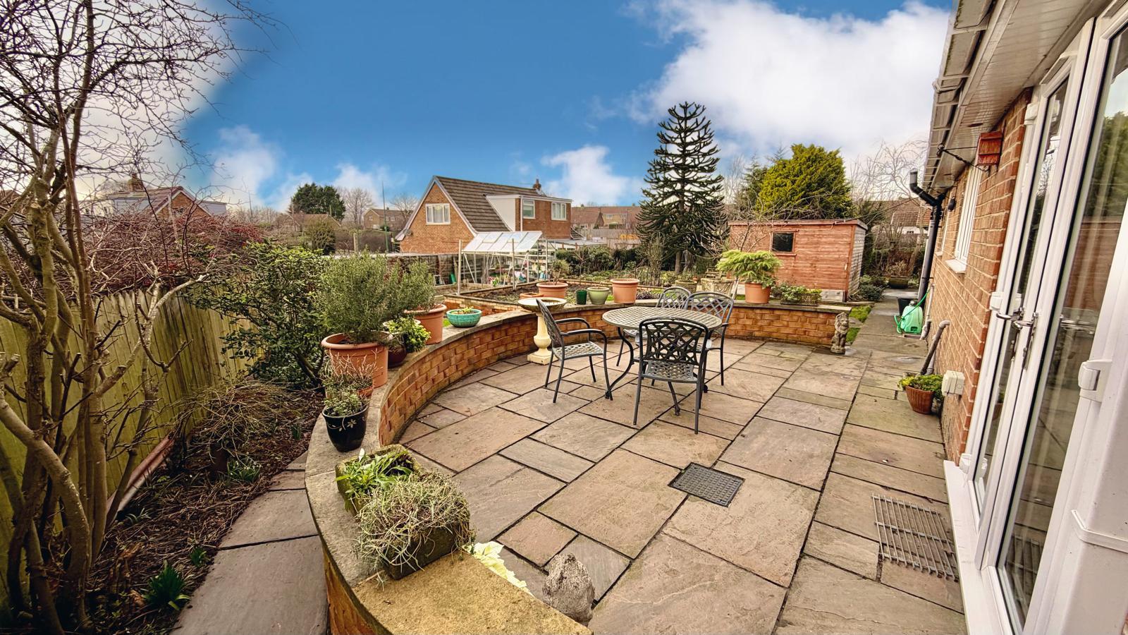 A large rear garden that comprises of several sectional areas including a raised stone patio and seating area with curved dwarf retaining wall, a central lawn, several meandering pathways, vegetable garden with raised timber planters, timber built storage shed, aluminium greenhouse , external tap, further patio areas stretch to the side, this is a substantial garden which the owners love to tend to, enjoying the many species of local wildlife and really is paramount for outside entertaining. Set within private hedging with many mature trees, shrubs and planting including several damson, apple and plum fruit trees, it's a gardeners' world of delight!