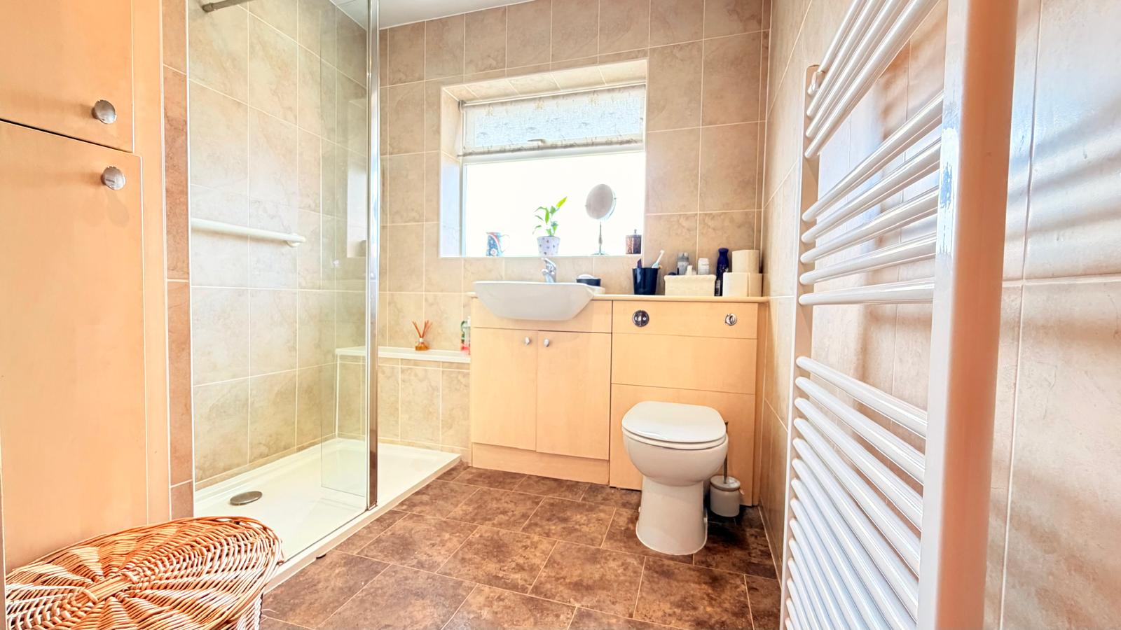 Fully tiled suite with walk in double shower enclosure and glazed sidee screen with overhead shower, side by side push button wc and wash hand basin in vanity surround with storage, built-in airing cupboard, PVC cladded ceiling with spot lighting, heated towel radiator, uPVC window to side aspect.