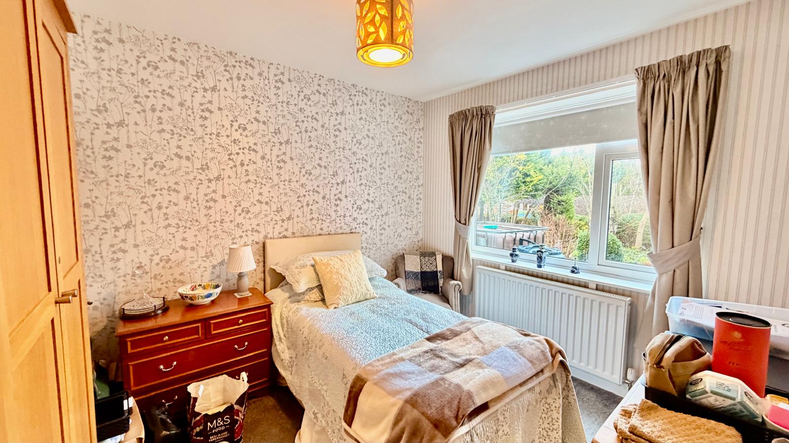 uPVC window to side aspect, fitted full length wardrobes with dresser and bedside tables and radiator.