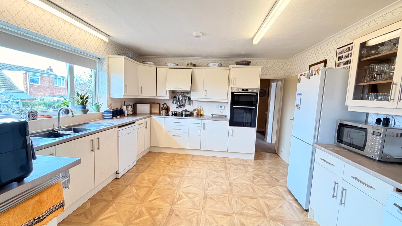 Fitted with a range of matching cream fronted wall and base units with laminate working surfaces, tiled splashbacks, plumbing for automatic washing machine and dishwasher, radiator, 1 1/2 bowl sink unit with mixer tap, integrated eye level double oven with four ring induction hob and overhead extractor hood, radiator, uPVC window to side aspect , ample space for a central breakfast table and door to inner hallway.