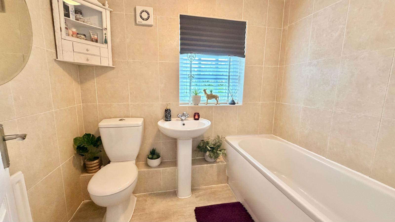 Frosted sash window to the front aspect with vertical blinds, fitted with a modern white three piece suite comprising; low level wc, pedestal wash basin and a panelled bath with shower over, ceramic tiled walls and wood effect vinyl flooring.