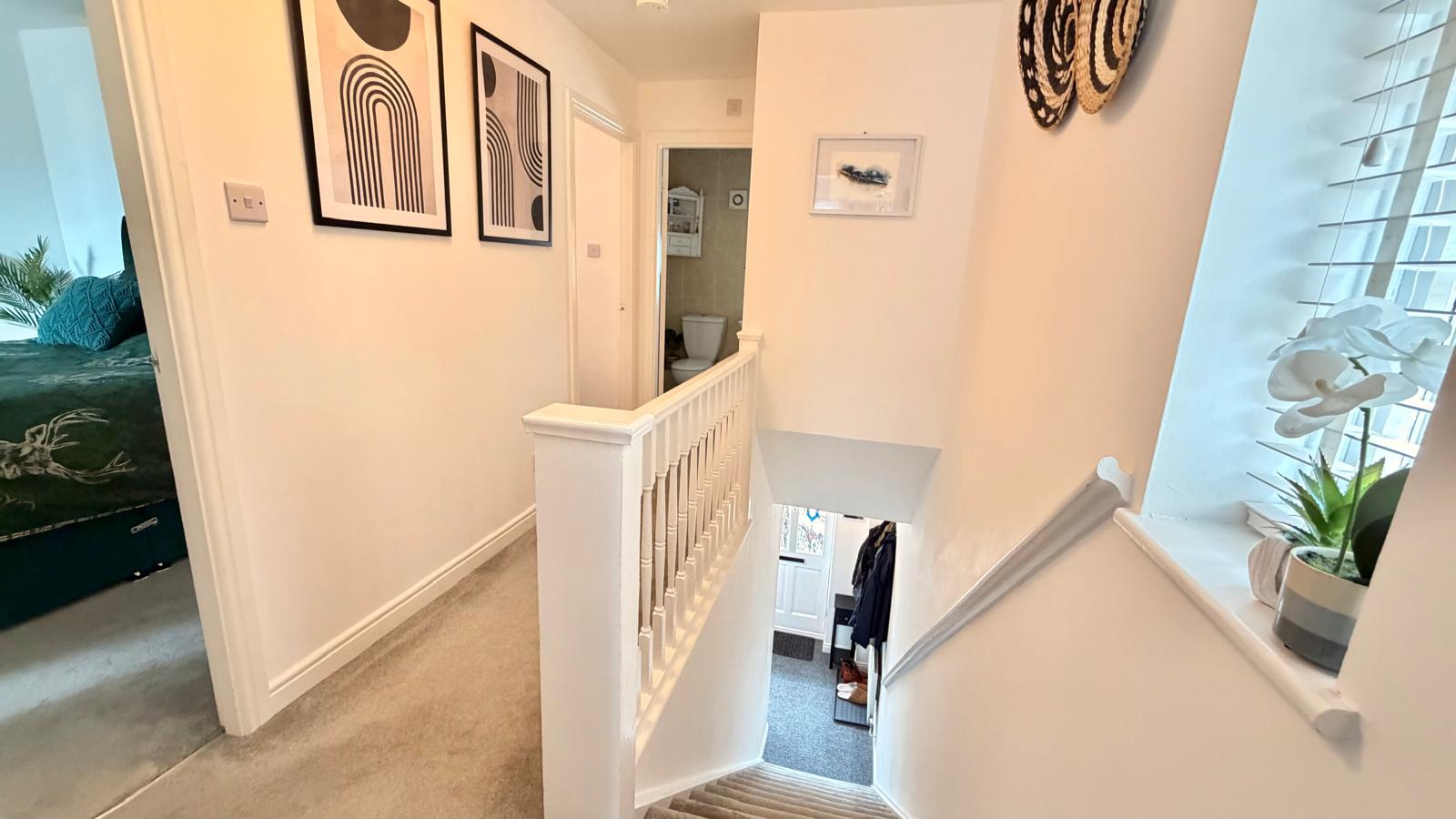 Large storage cupboard housing a gas combination boiler, window to side aspect and access to all first floor rooms.