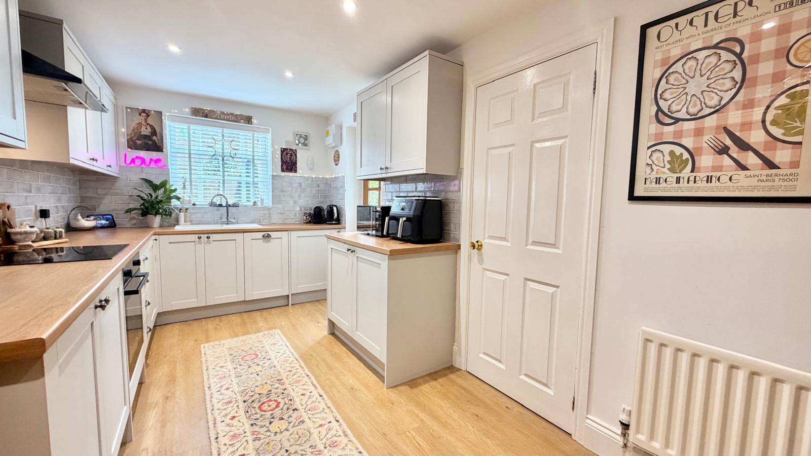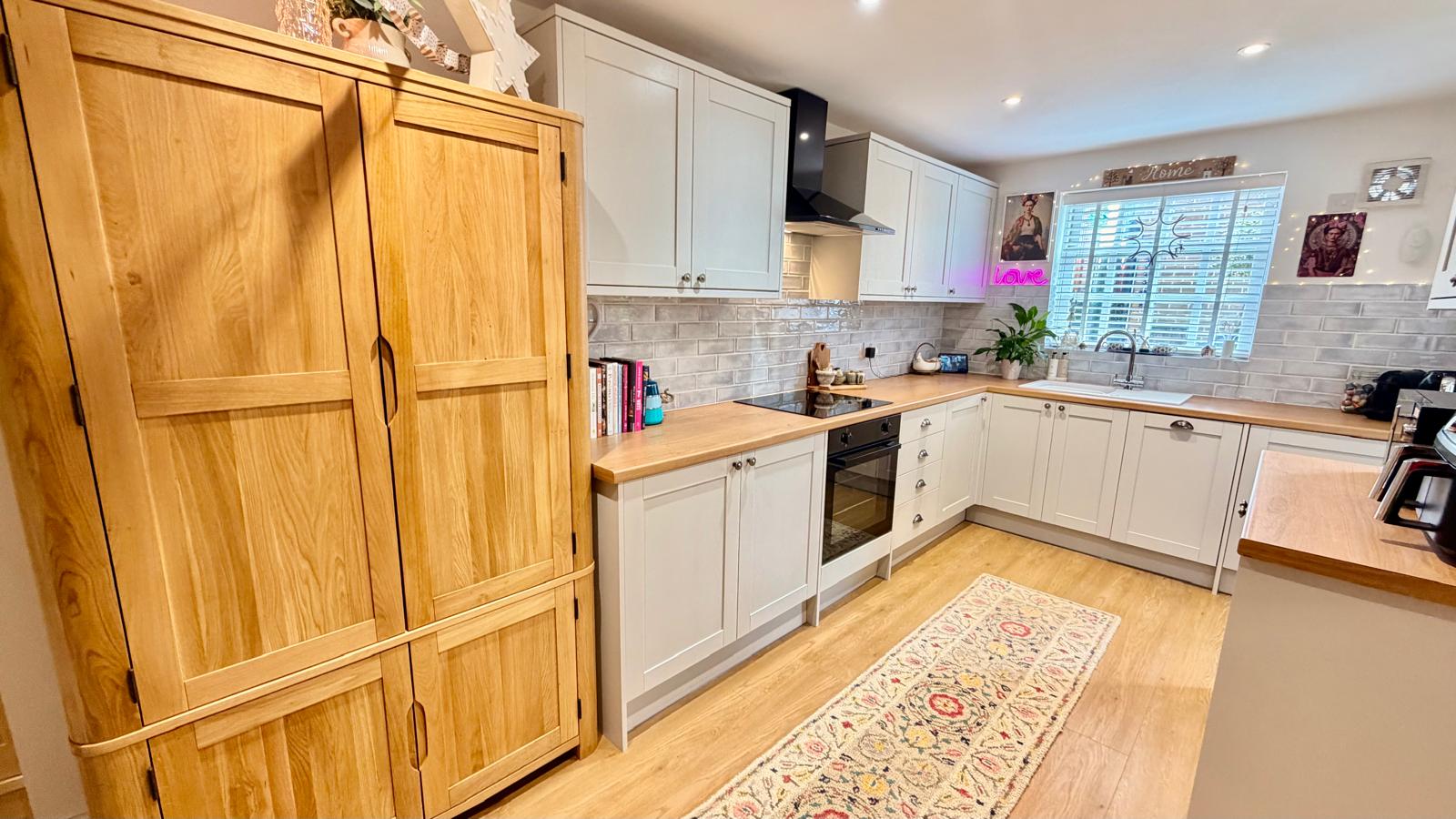 A stunning, well built wooden Kitchen fitted with a range of Beech effect wall and base units with granite effect roll top work surfaces, stainless steel sink unit with mixer tap, integrated fan assisted electric oven with four ring hob and stainless steel overhead extractor, integrated Bosch dishwasher, Metro tiled splashbacks, large understairs storage cupboard, ceramic tile flooring, window to rear aspect and door to the rear garden.