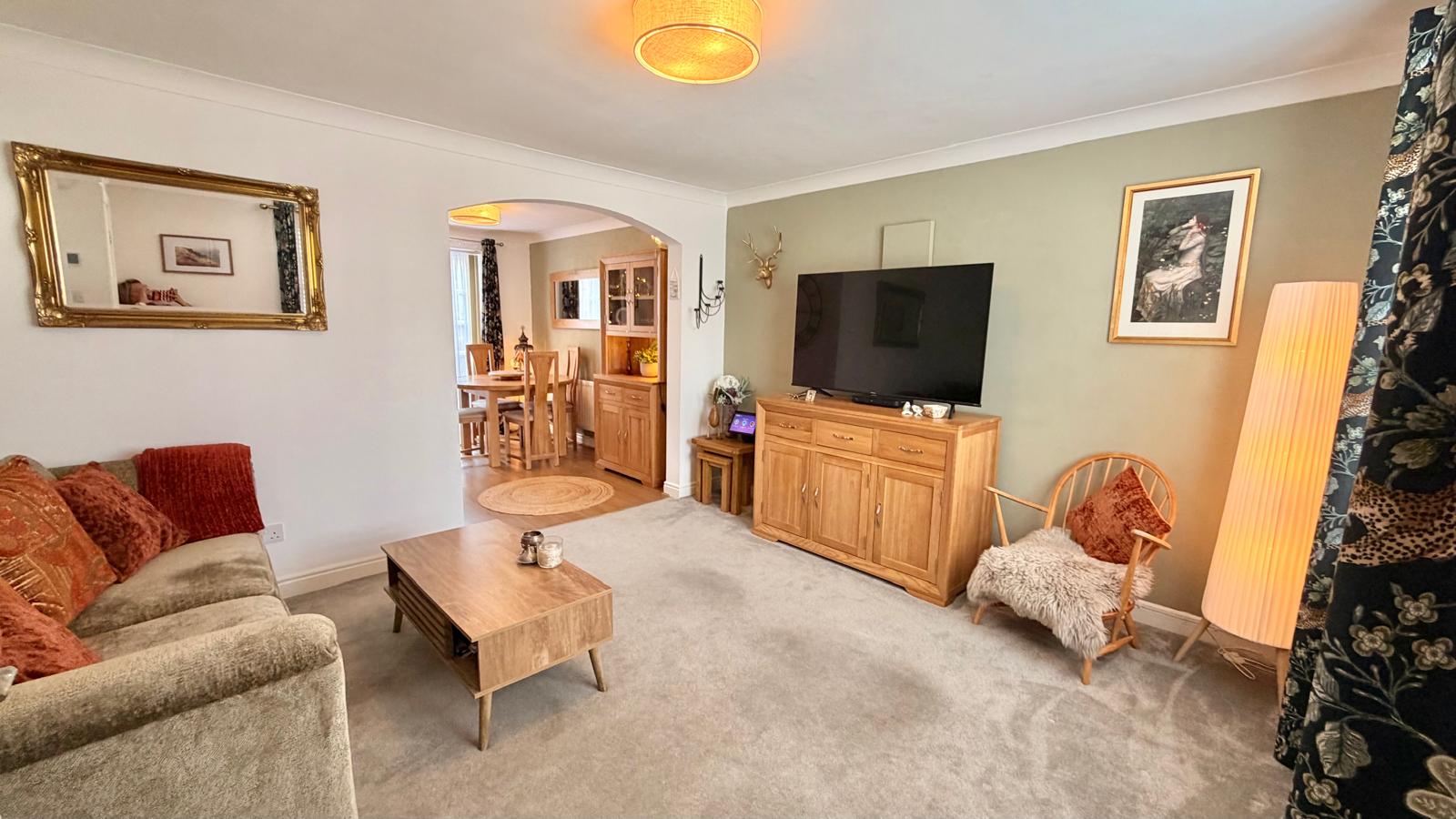Sash double glazed window to the front aspect, radiator, wall mounted room thermostatic central heating control, TV aerial point and archway to the Dining Room