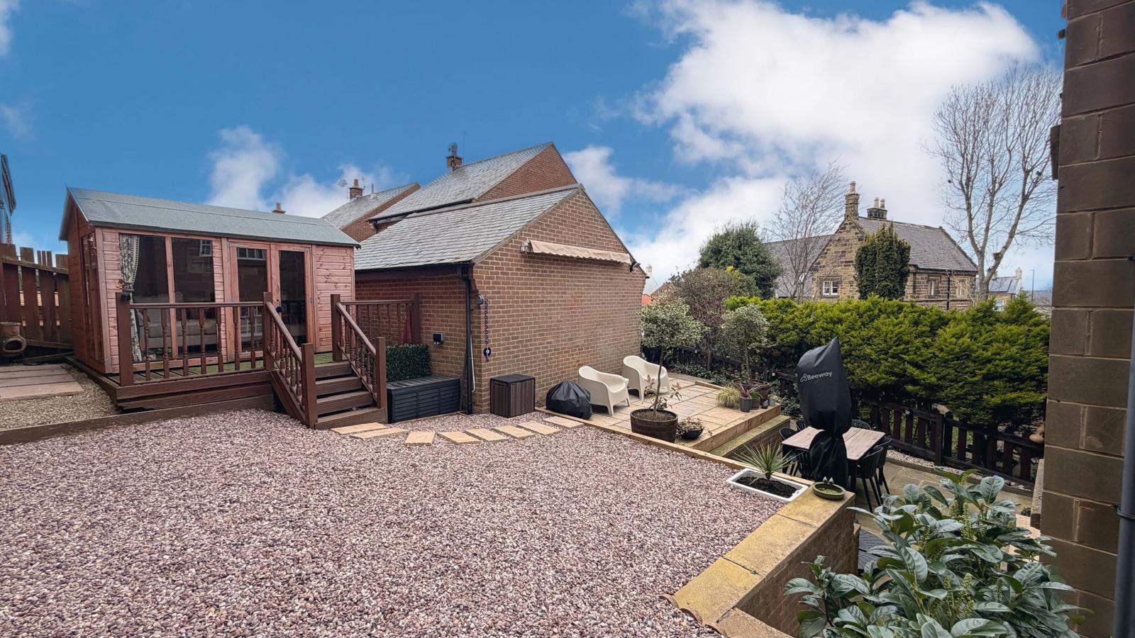 Fence enclosed rear gardens which offer a side garden that leads to the front, mainly gravelled and on two levels, being professionally landscaped within the last year, offering a paved patio area, raised terrace with timber summerhouse, pathway and gate access leading to the rear drive and detached garage, An absolute sun trap to sit with a good book and enjoy the sunshine.