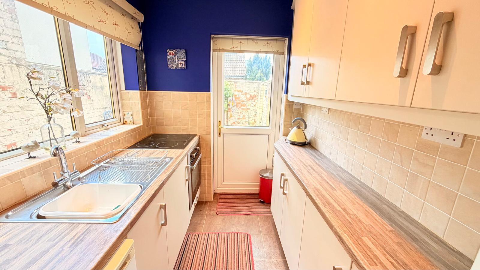 Stunning Cream modern fitted kitchen with a range of wall and base units, built in oven and ceramic hob, tiled splashback and stainless steel sink with mixer tap, integrated washer, wall mounted central heating boiler, uPVC window to the side, ceramic tiled flooring, spot lighting and a uPVC half-glazed door to the rear courtyard.