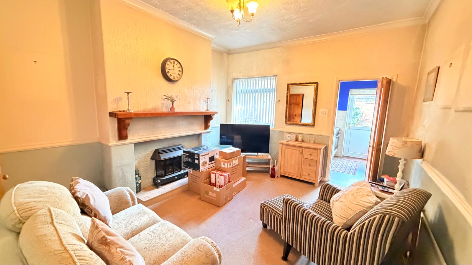 Situated at the rear of the property with double-glazed window, radiator, door with staircase to first floor, feature fireplace with a gas fire, an understairs storage cupboard and a door leading to:-