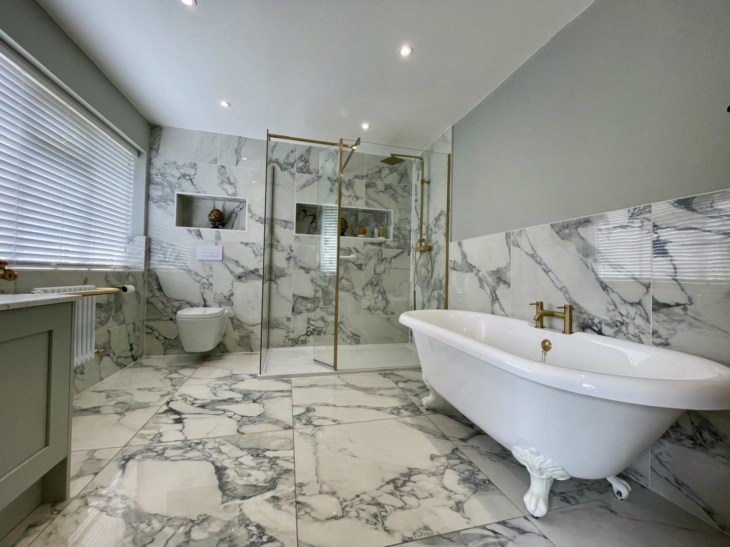 A recently re-fitted four piece white suite comprising of a free-standing rolltop bath, a double walk-in shower enclosure with waterfall shower attachment, grey vanity unit housing the wash hand basin and back-to-wall wc. Marble tiled walls and flooring, brushed gold fixtures and fittings, spotlighting, traditional style radiator and uPVC double glazed window to rear.