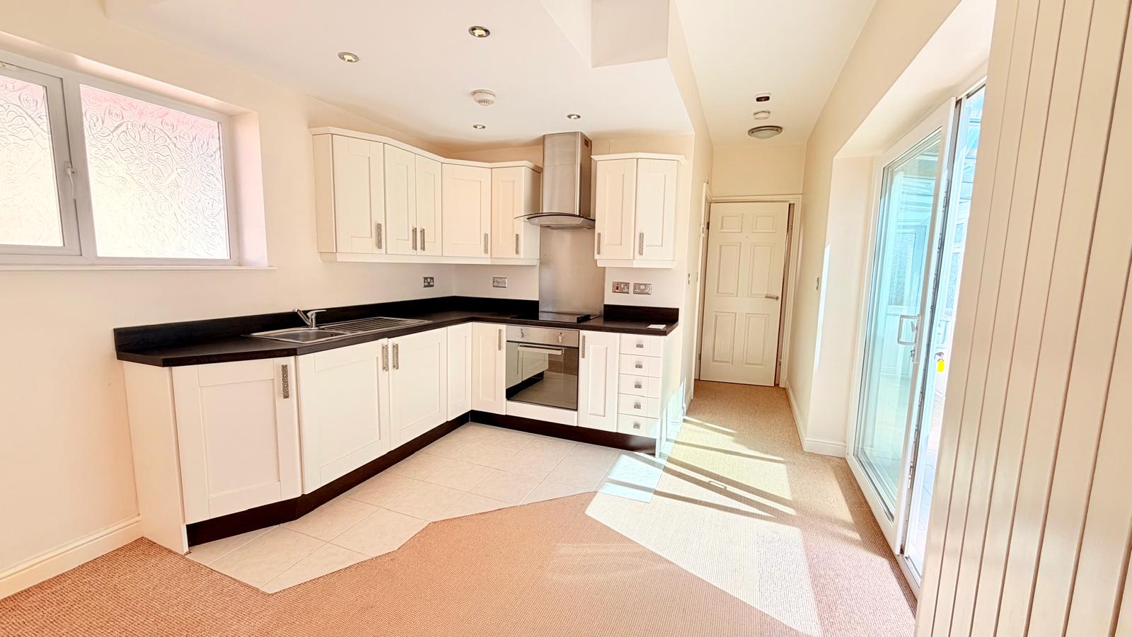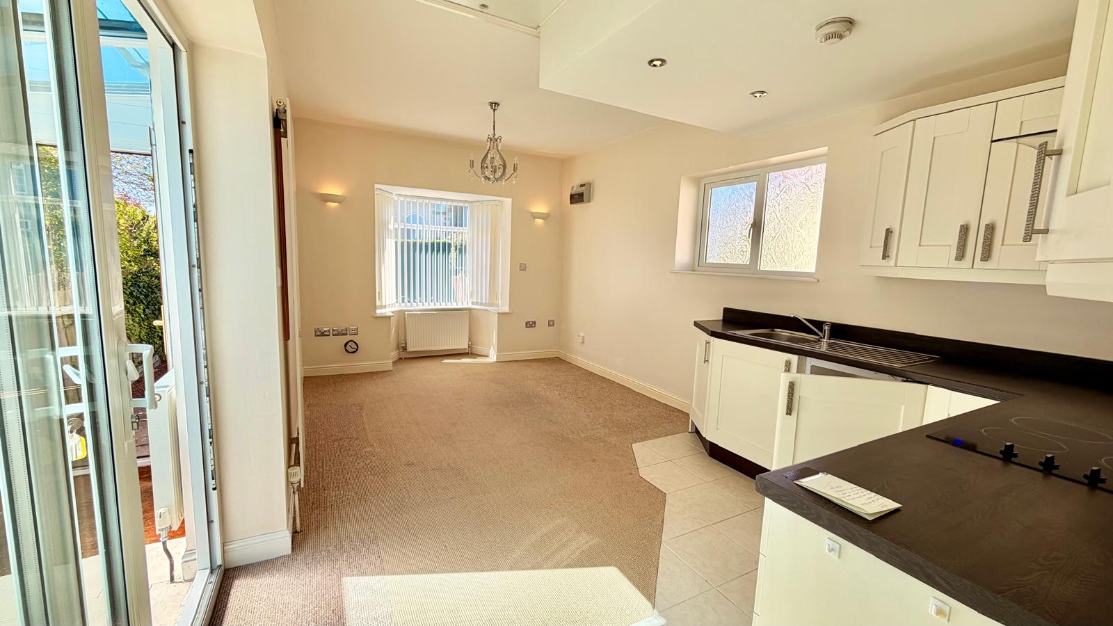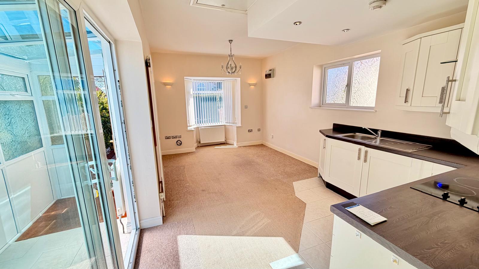 Fitted with a matching range of cream fronted wall and base units with laminate worktops, upstand, integrated fan assisted electric oven with four ring electric hob and overhead extractor hood, single drainer sink unit, a ceramic tiled floor, spot lighting and opaque window to side aspect. Double loft hatch with a retractable ladder leading to ample storage space, Double glazed patio doors to the side porch and access through to the inner hallway.