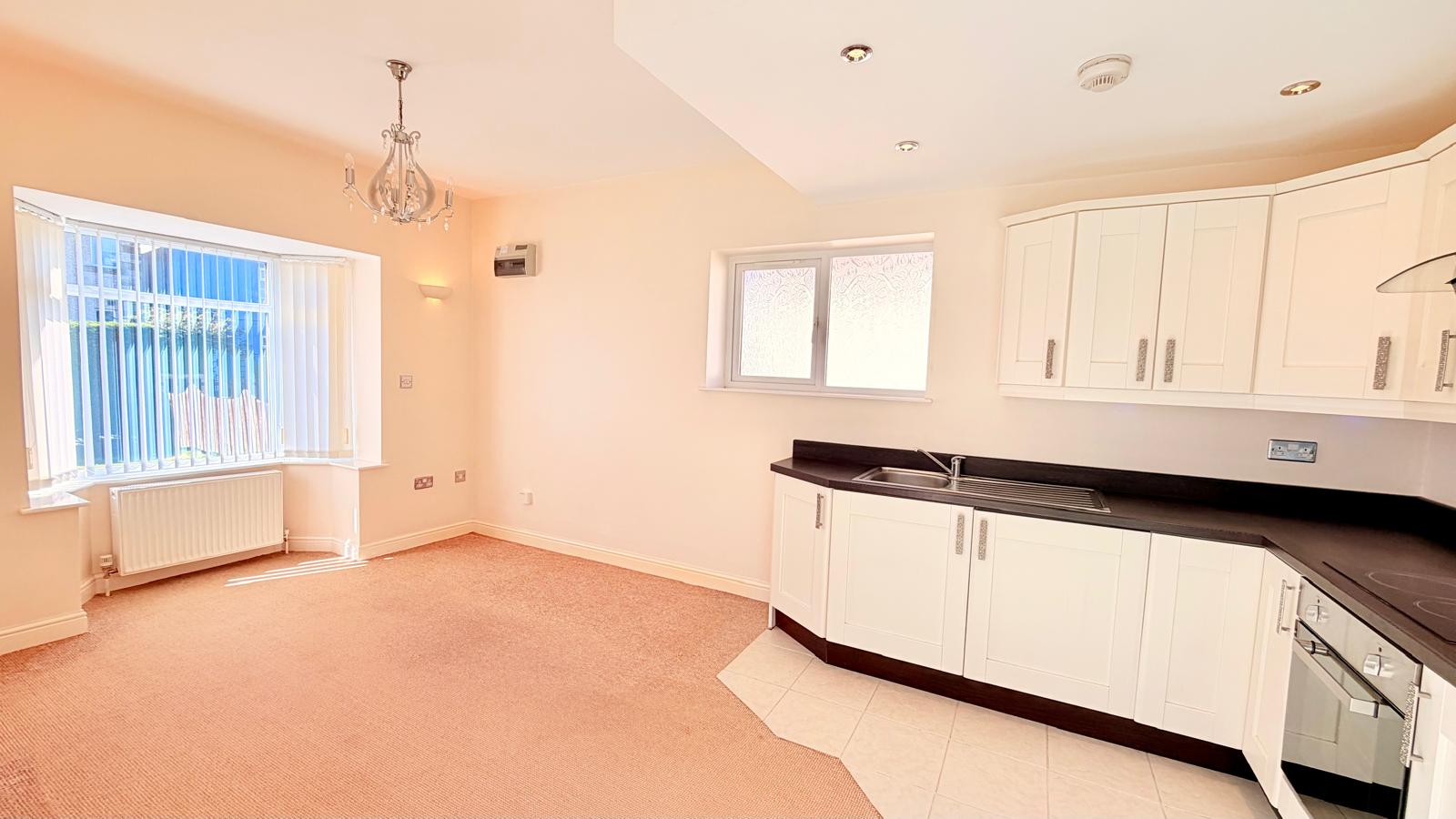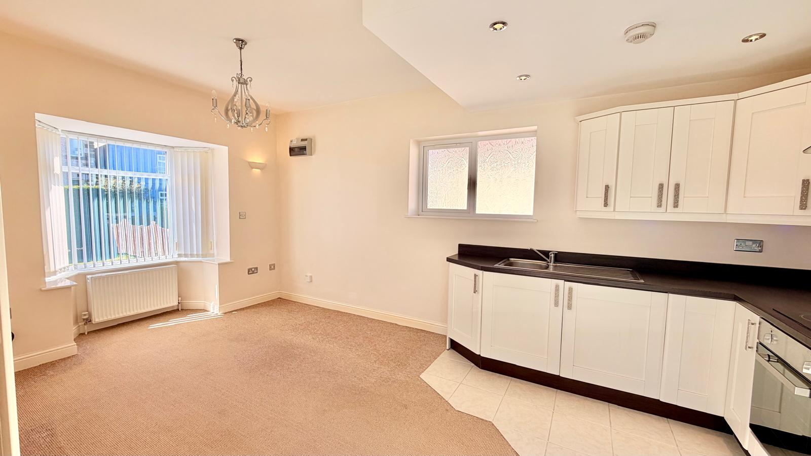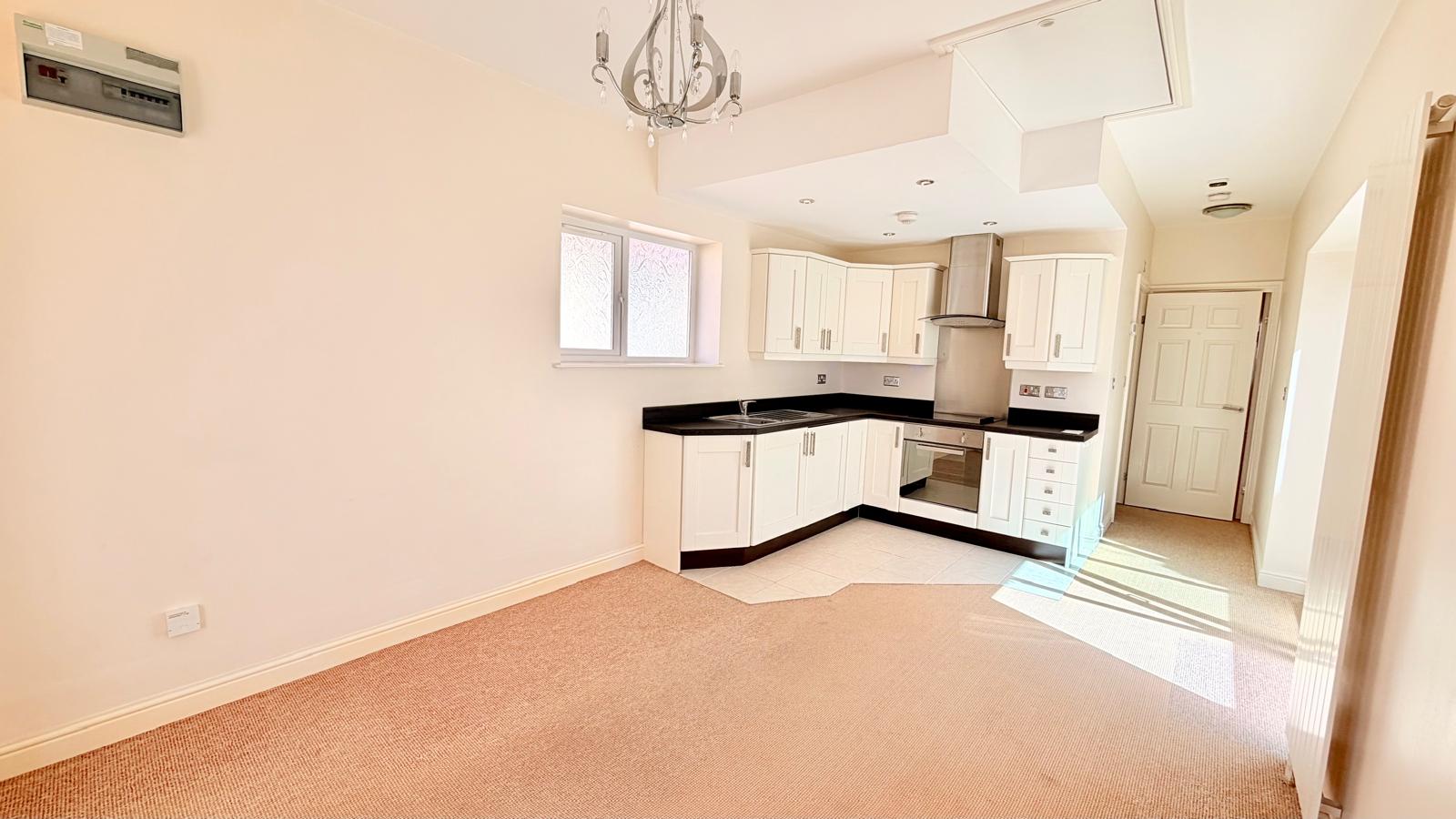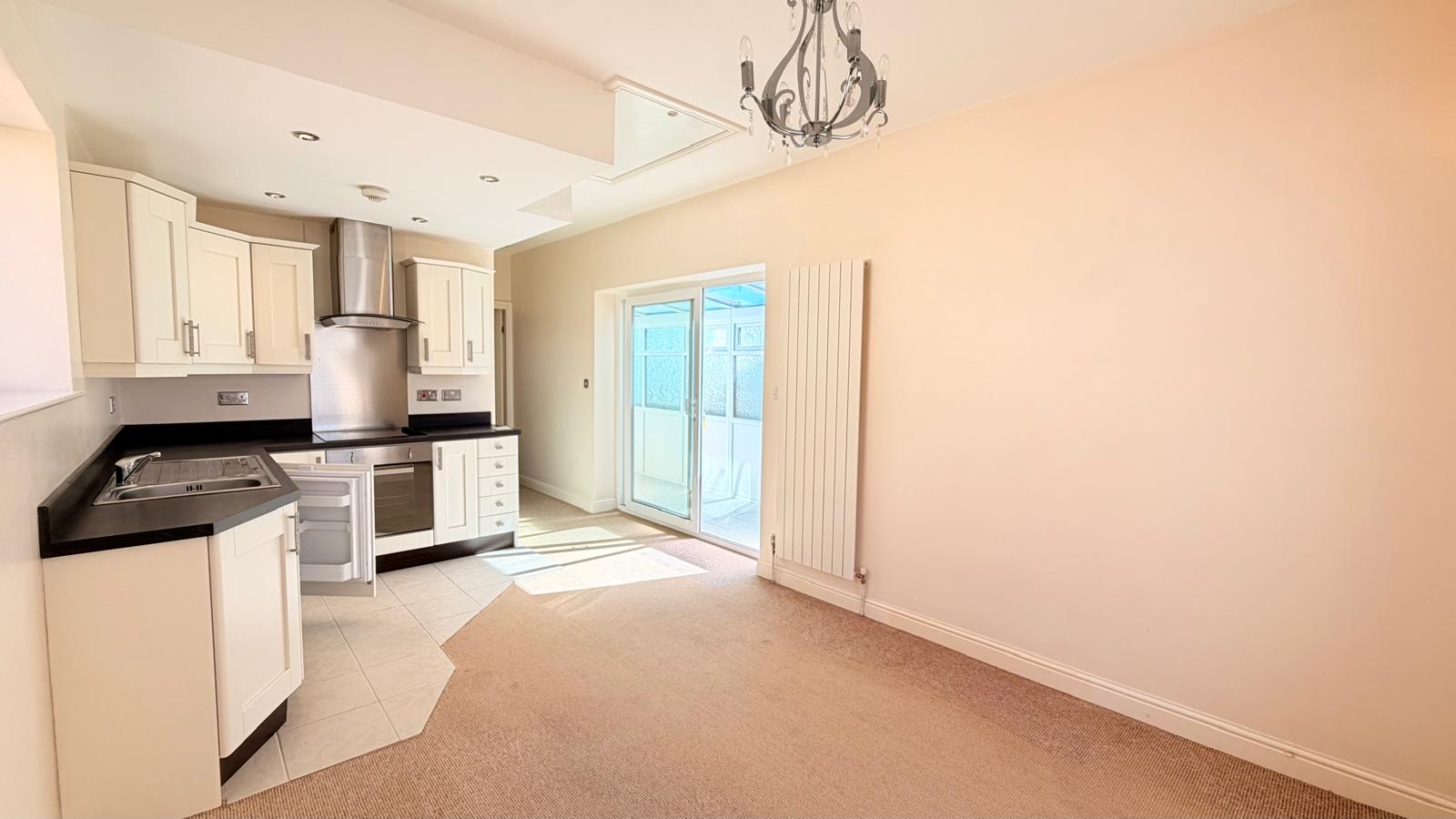 Fitted with a matching range of cream fronted wall and base units with laminate worktops, upstand, integrated fan assisted electric oven with four ring electric hob and overhead extractor hood, single drainer sink unit, a ceramic tiled floor, spot lighting and opaque window to side aspect. Double loft hatch with a retractable ladder leading to ample storage space, Double glazed patio doors to the side porch and access through to the inner hallway.
