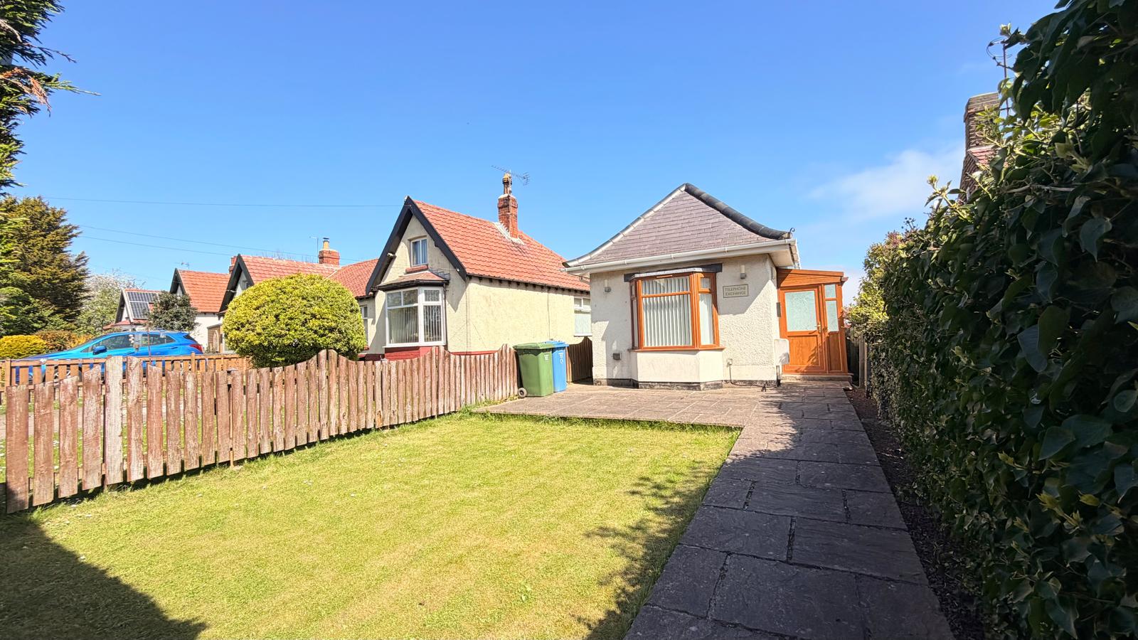 West facing front garden laid mainly to lawn with a pathway and patio area.