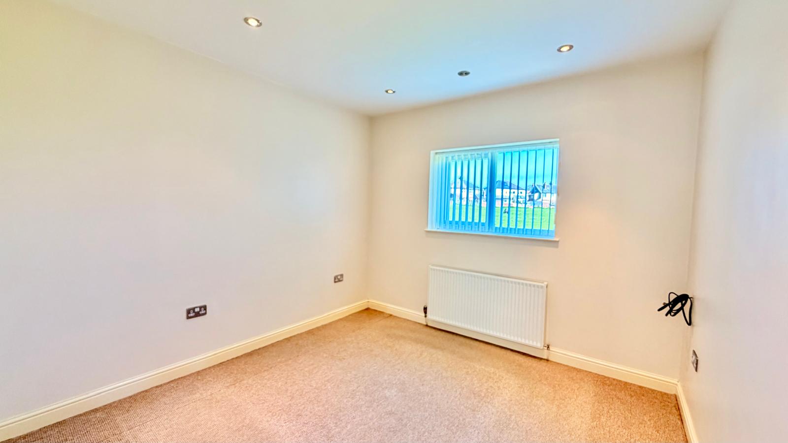 uPVC double glazed bay window to front, two single wall lights, modern vertical radiator, TV aerial point, carpeted flooring opening into:-