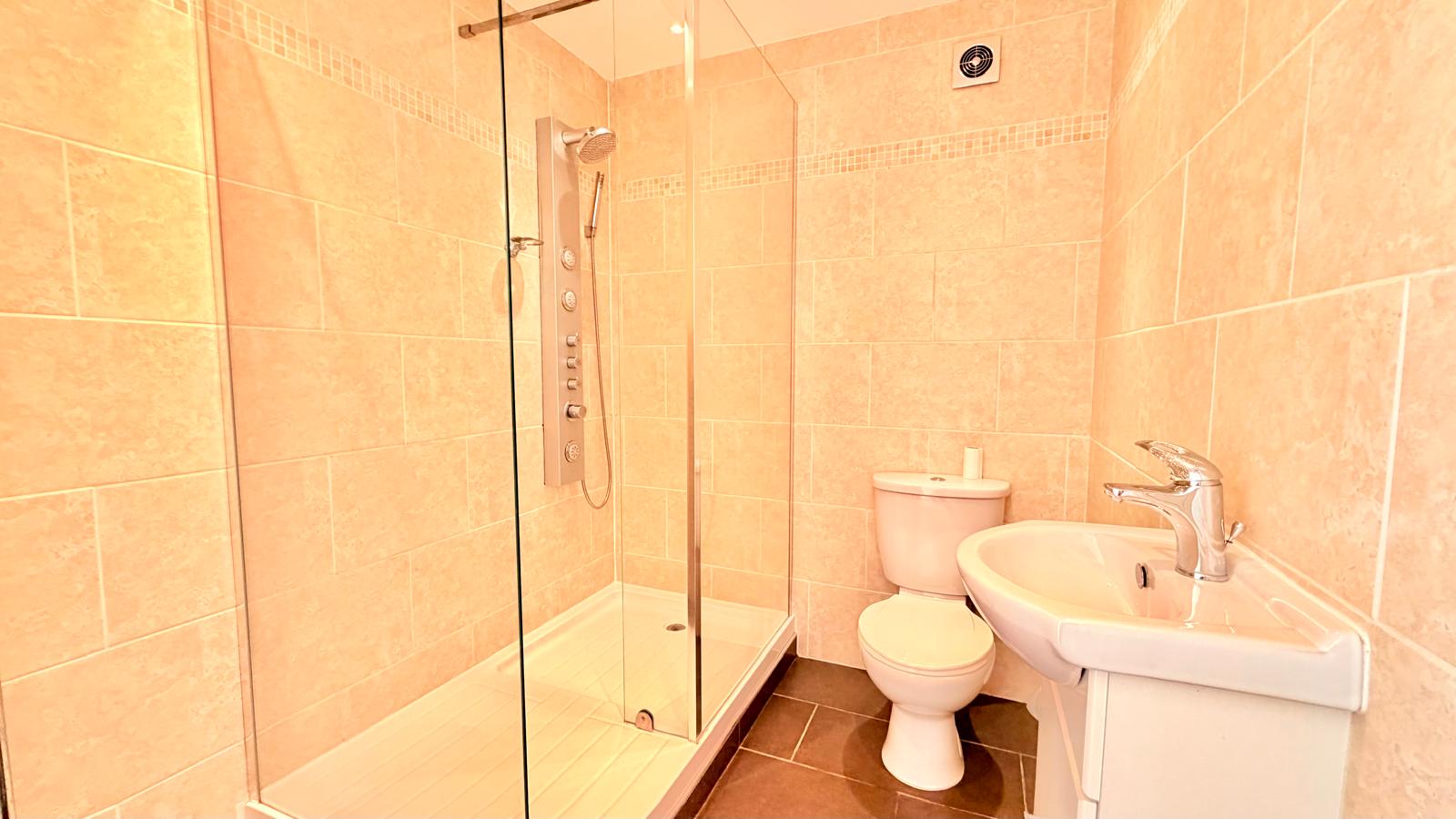 Fully tiled three piece suite in white, featuring a double walk in shower with a low profile tray and glass side screen, a pedestal wash hand basin, push-button wc, a ceramic tiled floor and radiator.