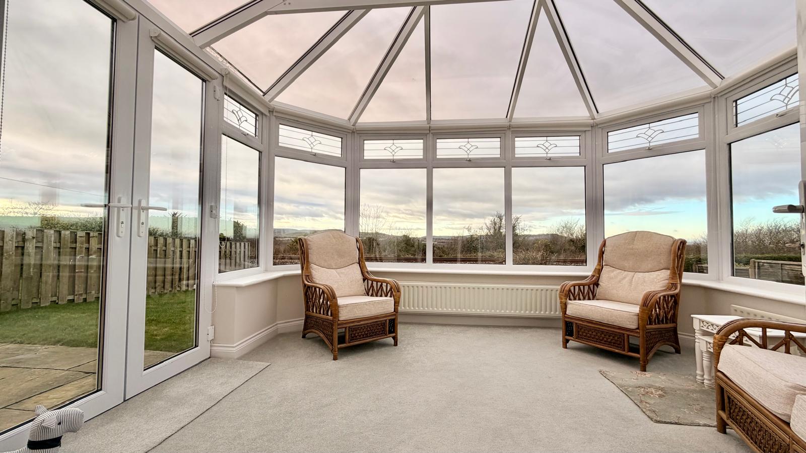 A lovely light and airy room enjoying an open aspect into the rear garden, with carpet floor, two radiators, uPVC windows to three sides and uPVC double glazed French doors to rear.