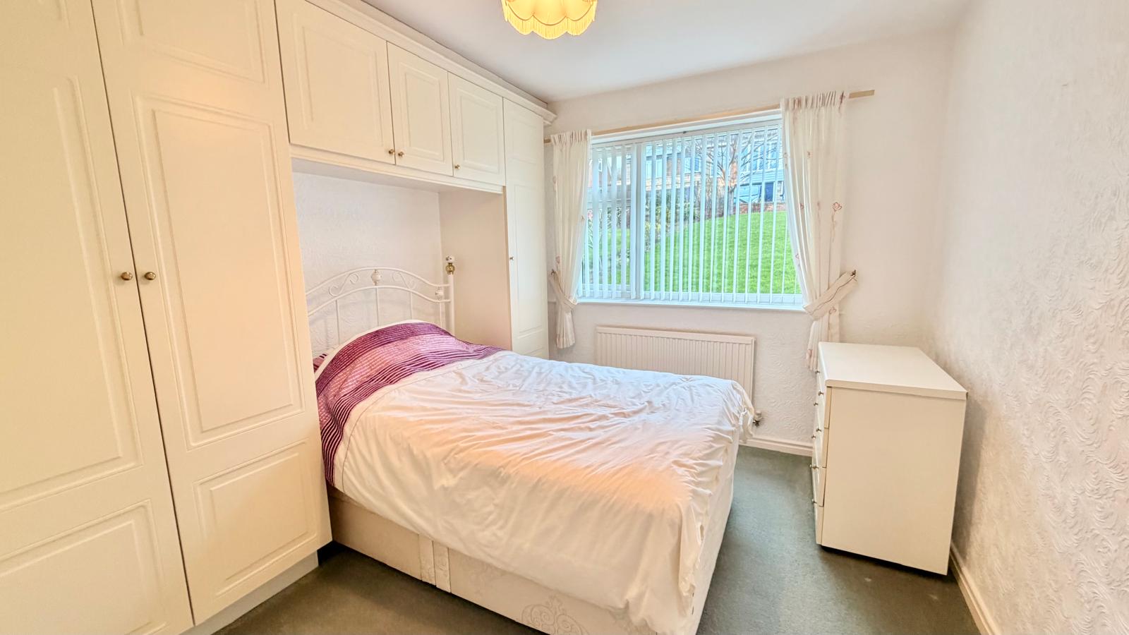 Another double bedroom with carpet to the floor, uPVC window to the front aspect, radiator and fitted wardrobes with bed recess and overhead storage.