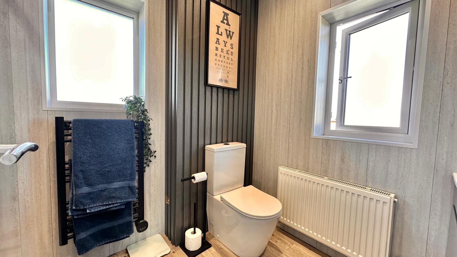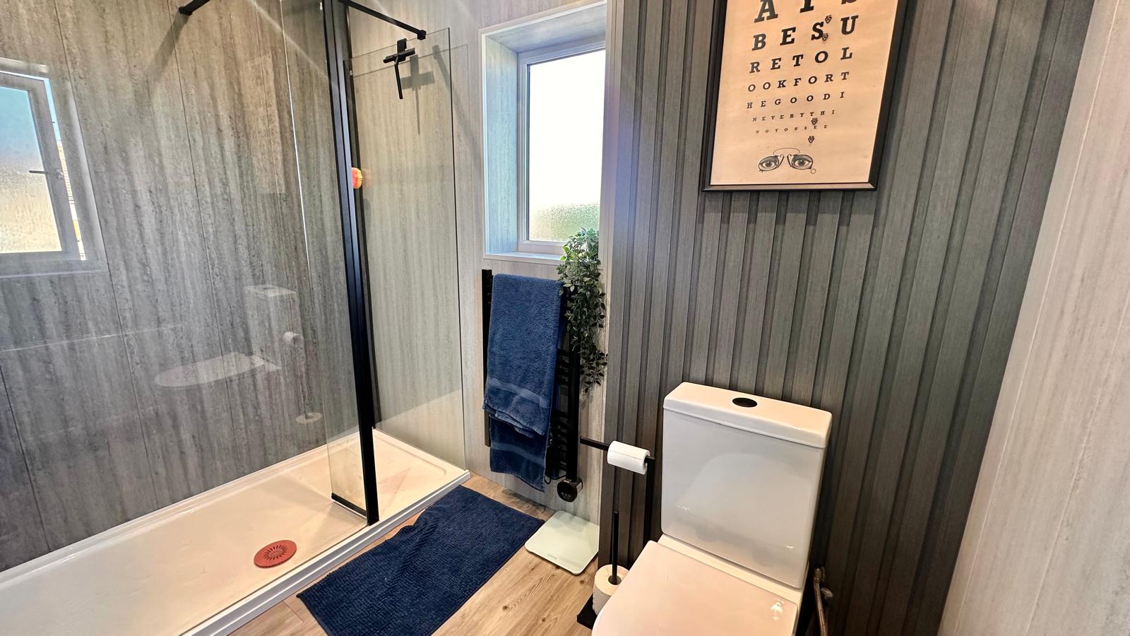 A modern black and white Contemporary suite with walk in double shower cubicle with glazed side screen and overhead shower, push button wc, vanity wash hand basin in surround with cupboard under, uPVC windows to the rear and side, grey laminate flooring, PVC ceiling with inset spotlighting.
