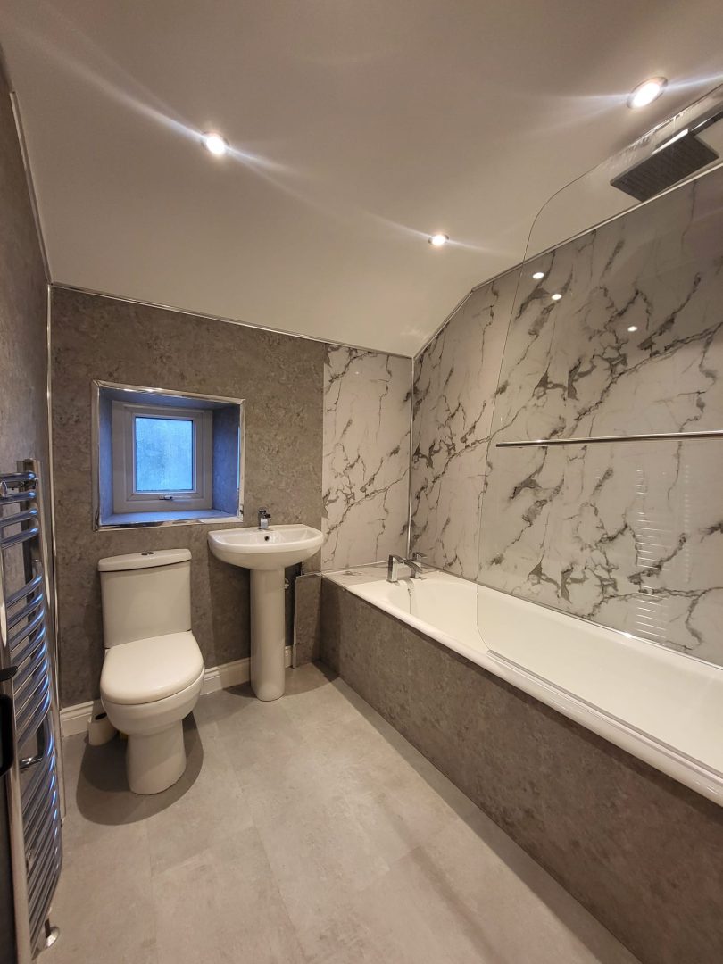 A modern bathroom suite comprising a panelled bath with overhead shower and glazed screen, low-level WC, wash basin, chrome towel radiator, tiled floor, and frosted double-glazed window.