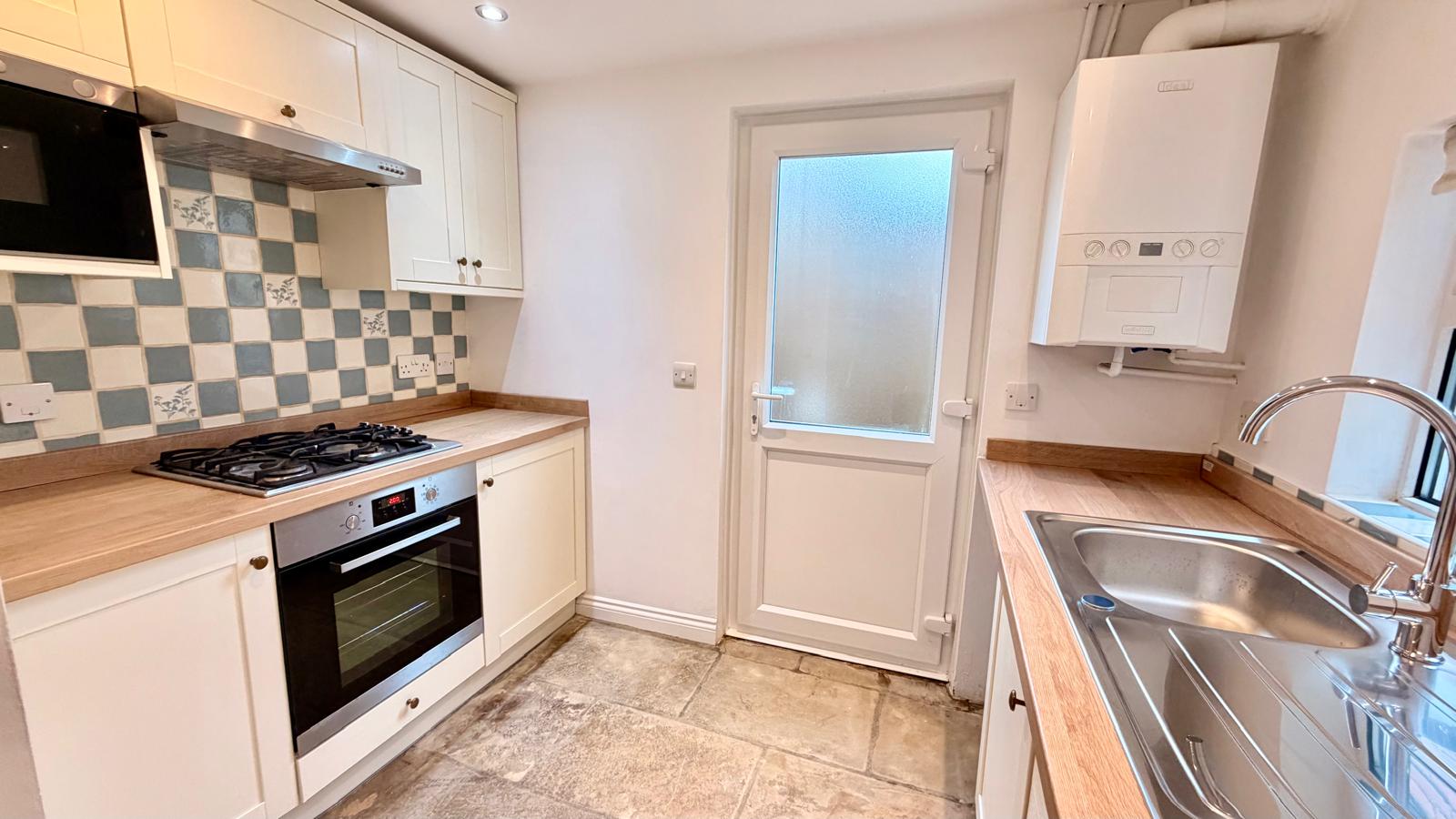 Re -fitted kitchen includes a range of wall and base units with work surfaces, a single drainer sink, a gas hob with extractor, an electric oven, integrated microwave, plumbing for a washing machine, and a wall-mounted central heating boiler. A double-glazed door opens to the rear yard, while tiled splashbacks and a stone floor complete the stylish finish.