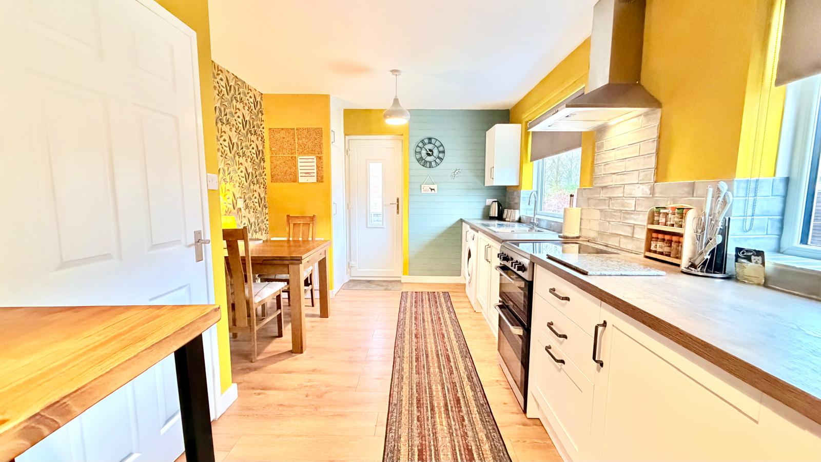 Recently reconfigured to offer a good sized family dining kitchen with a modern range of wooden fronted base cupboard with drawers, laminate worktop and Metro tiled splashbacks, plumbing for automatic washing machine, gas cooker point, overhead stainless steel extractor hood, two uPVC double glazed windows to the rear overlooking the garden, laminate flooring, space for dining table, built in cupboard housing wall mounted central heating boiler, two radiators, uPVC double glazed door to the rear aspect.